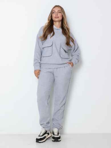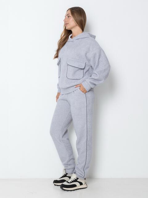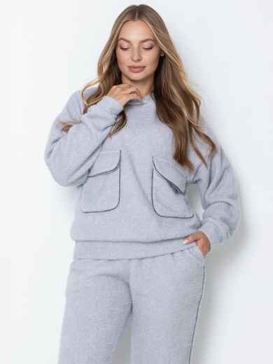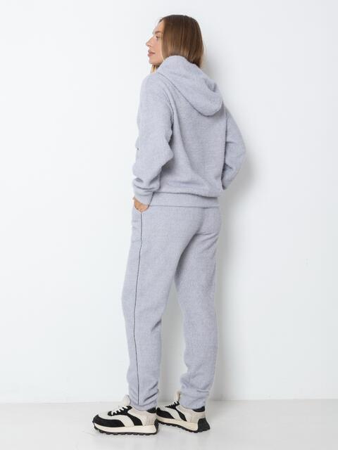 Фактурний костюм-двійка з теплої трикотажної альпаки. Худі вільного крою. Доповнено капюшоном. Спереду розташовані об'ємні накладні кишені з контрастним кантом. Штани вільного крою. Талія виконана гумкою для комфортної посадки. З прорізними кишенями в боковому шві. Манжета створює зручну фіксацію знизу. З лампасами у вигляді блискучого канта.
