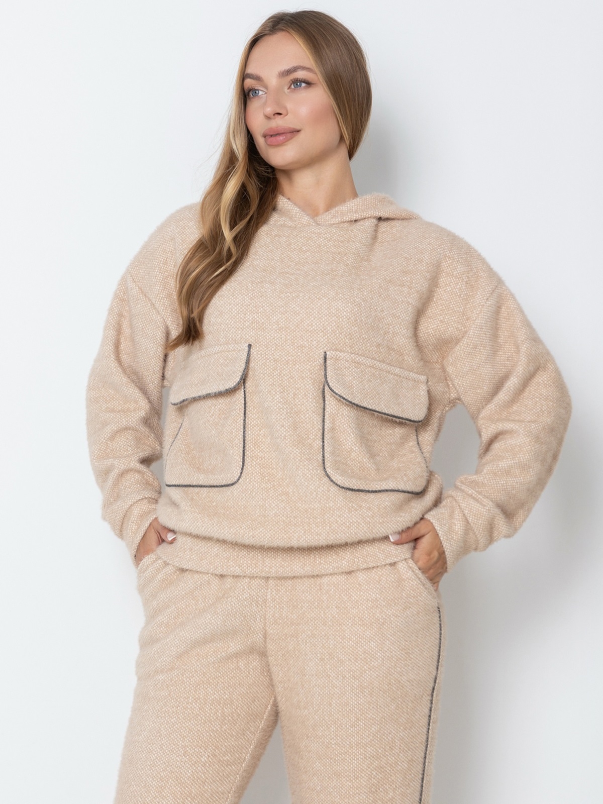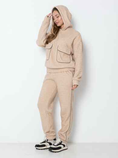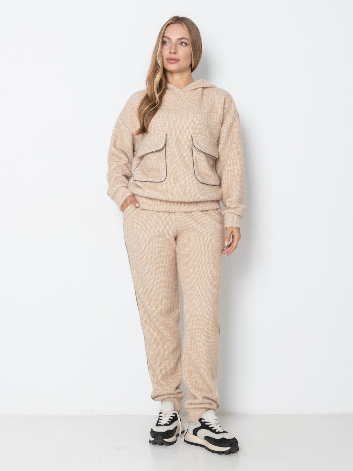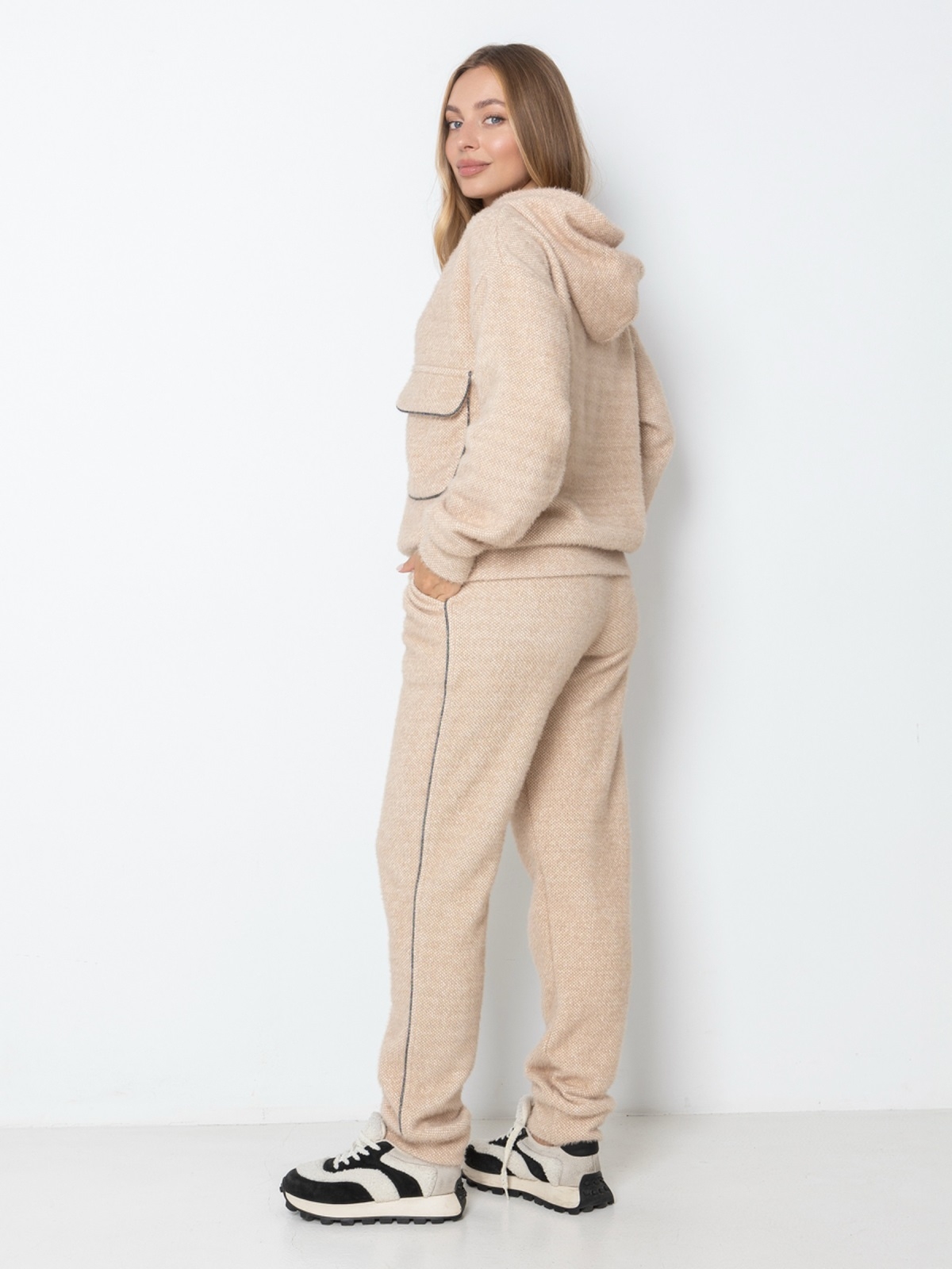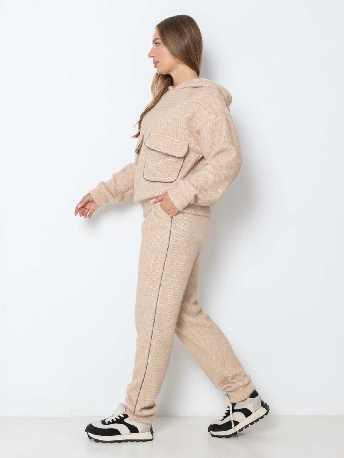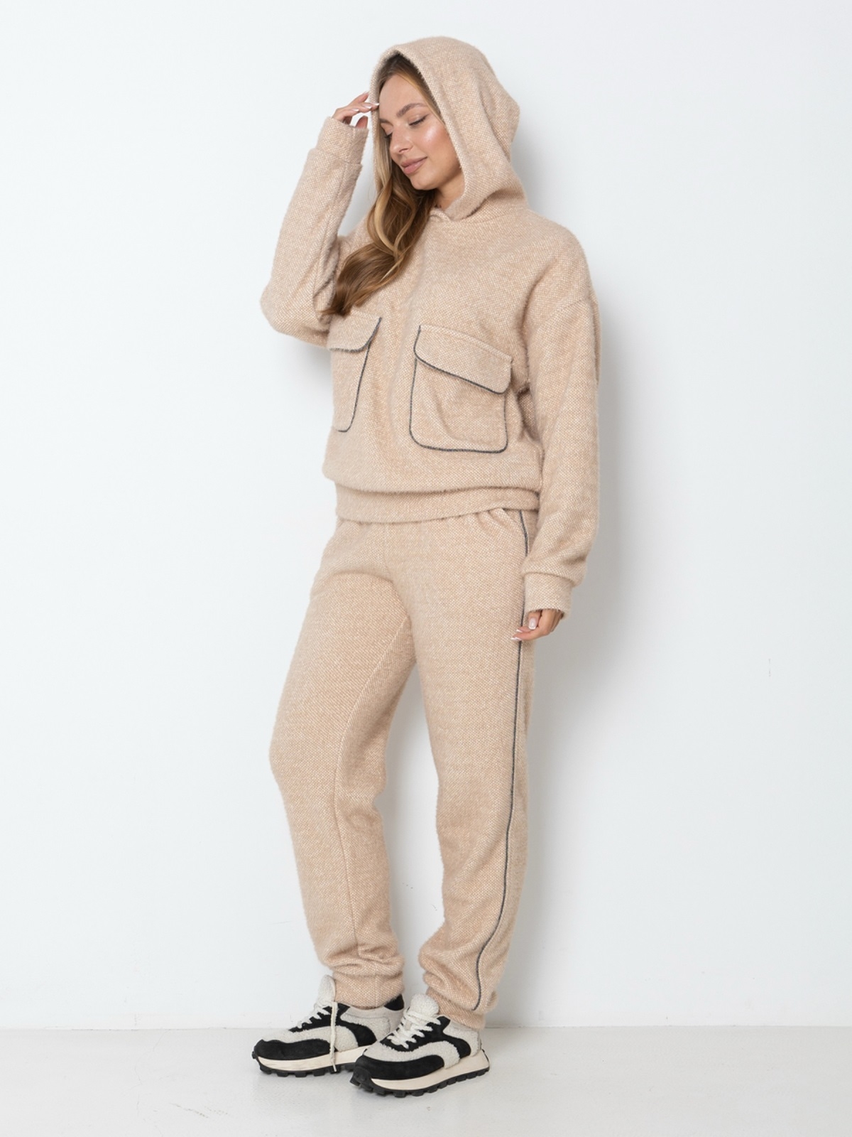 Фактурний костюм-двійка з теплої трикотажної альпаки. Худі вільного крою. Доповнено капюшоном. Спереду розташовані об'ємні накладні кишені з контрастним кантом. Штани вільного крою. Талія виконана гумкою для комфортної посадки. З прорізними кишенями в боковому шві. Манжета створює зручну фіксацію знизу. З лампасами у вигляді блискучого канта.