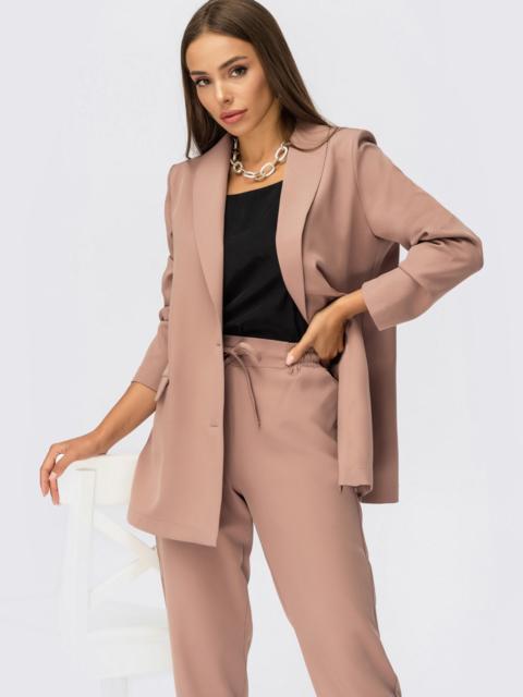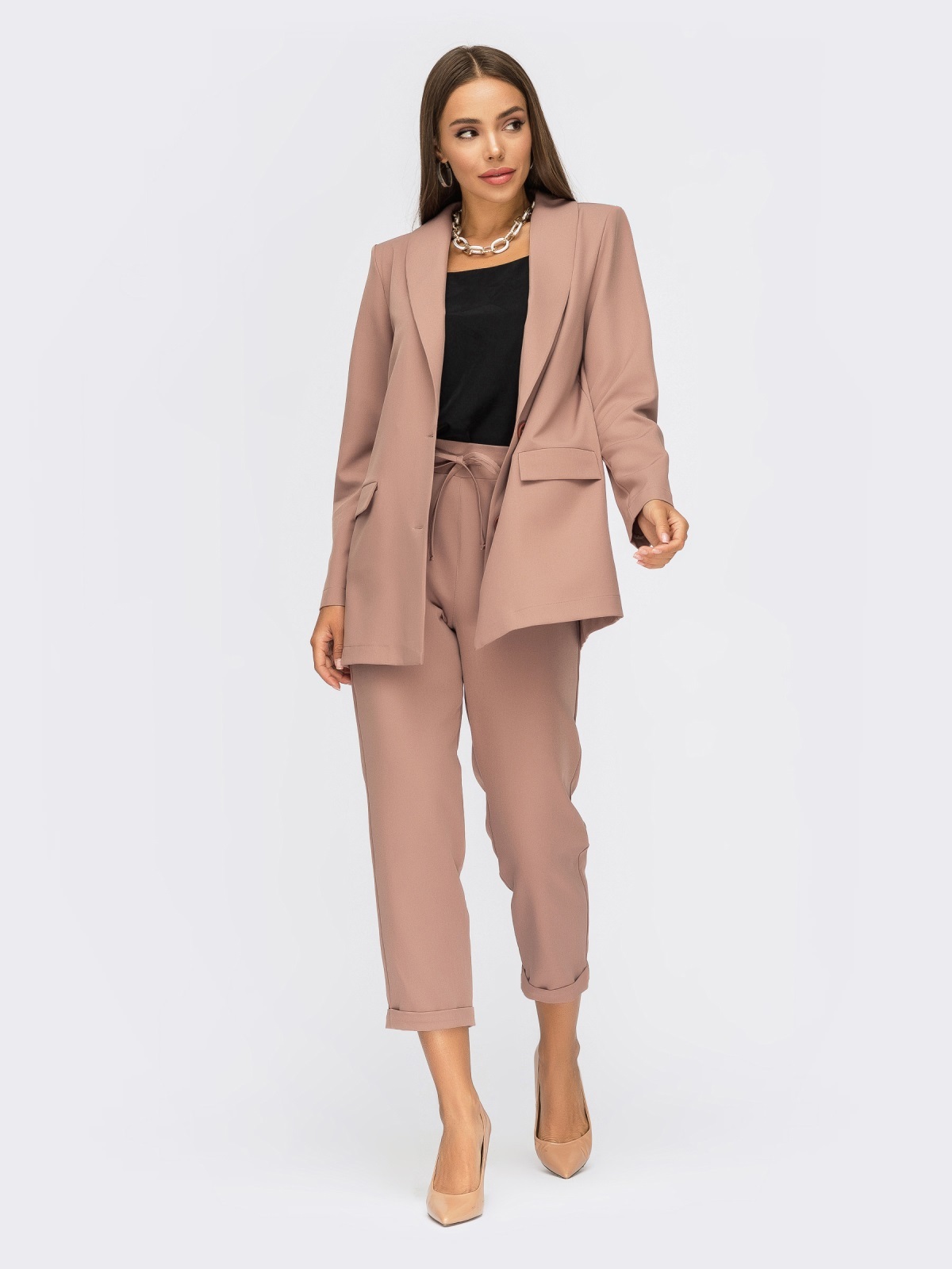 Стильний діловий костюм-трійка. Подовжений піджак з накладними кишенями, без підкладки та укорочені брюки з відворотами і кулискою в поясі. Доповнює образ легка блузка прямого крою без рукавів з V-подібним вирізом горловини.