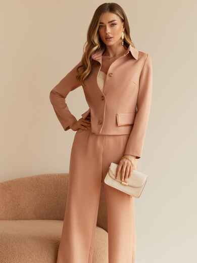 Елегантний костюм-двійка у класичному стилі виглядає витончено та сучасно. Модель виконана з костюмної тканини.