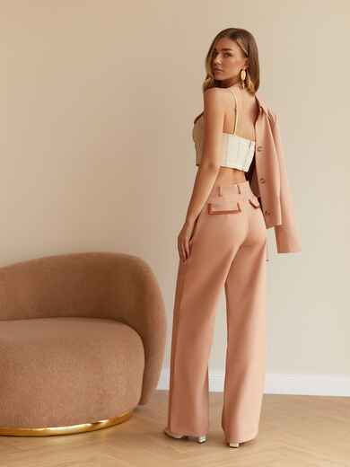 Жакет має відкладний комір, застібається на ґудзики та доповнений декоративними клапанами спереду. Штани прямого крою із защипами спереду мають бокові кишені та застібаються на блискавку і ґудзик. На задній частині розташовані імітації кишень з клапанами. Пояс у комплект не входить.