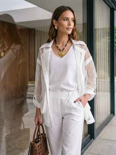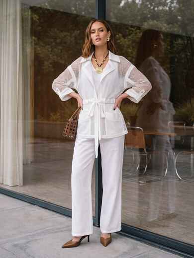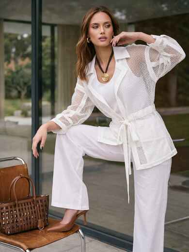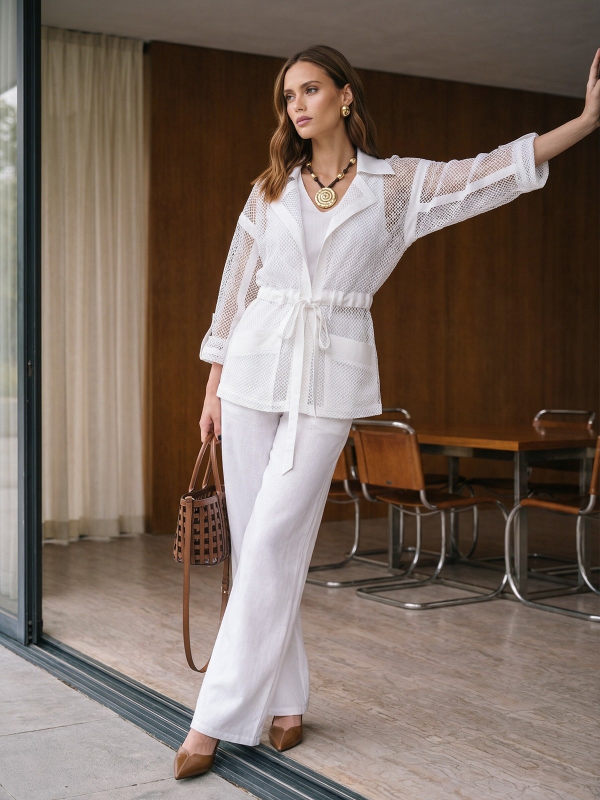 Костюм із напівпрозорим жакетом із сітчастої тканини та лляними штанами прямого крою в сучасному стилі виглядає легко й актуально. Молочний відтінок формує спокійний образ.