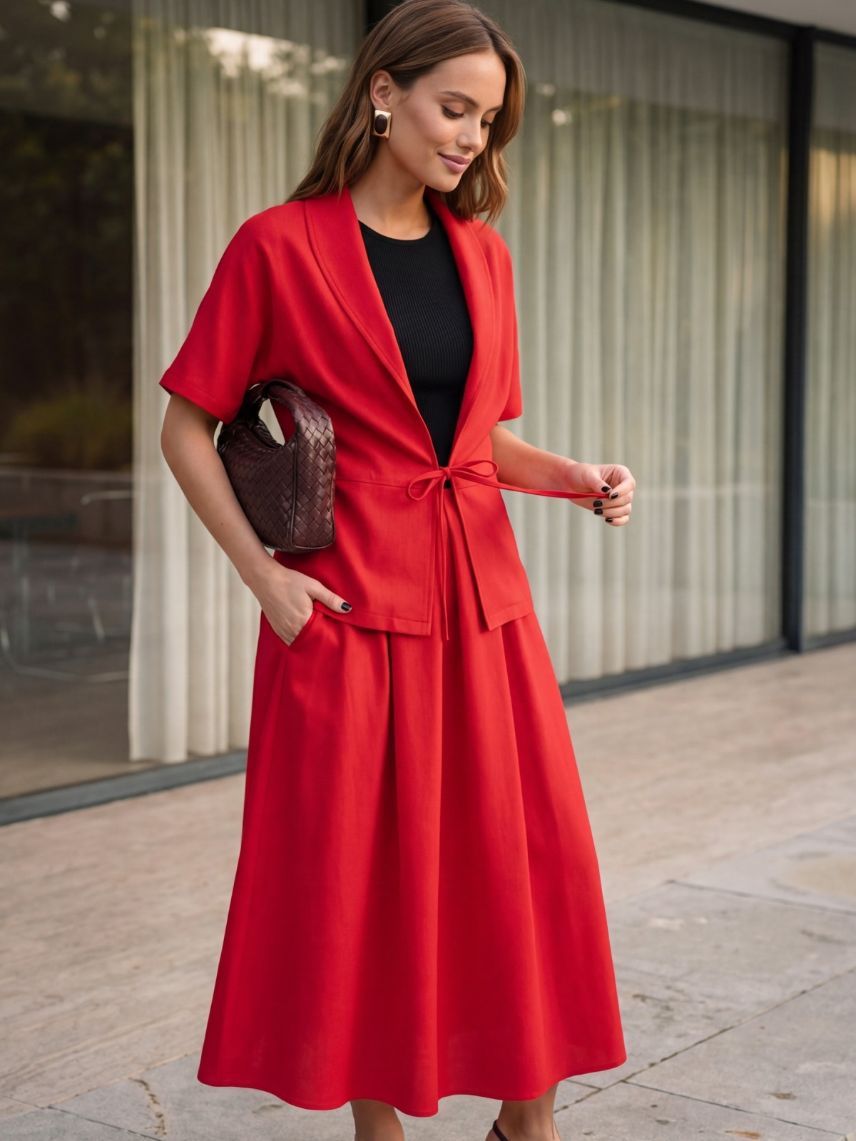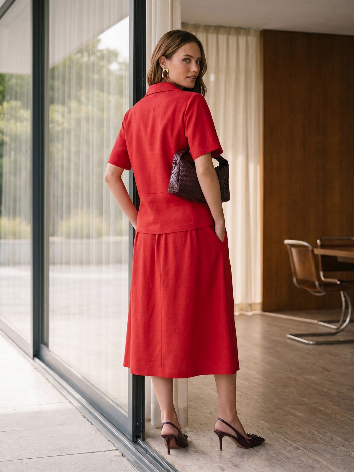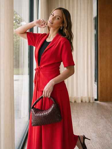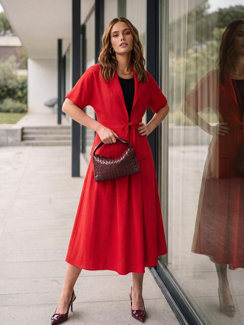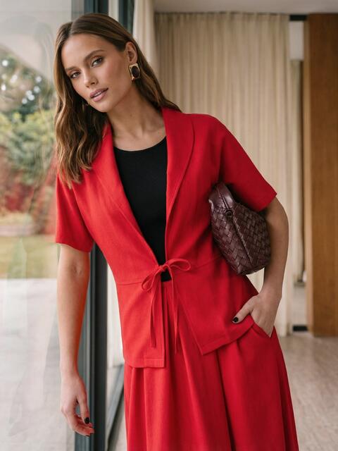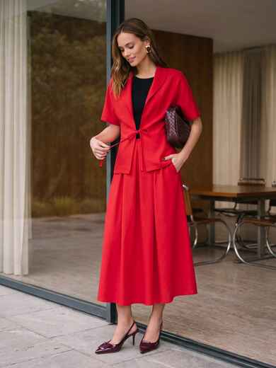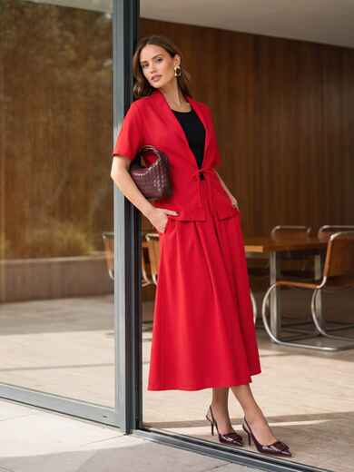 Сукня без застібок поєднує трикотажний верх і лляну спідницю зі складками, які створюють м’який силует. Бокові кишені додають практичності. Жакет із льону має вільний крій і фіксується на зав’язках, доповнюючи загальний образ.
