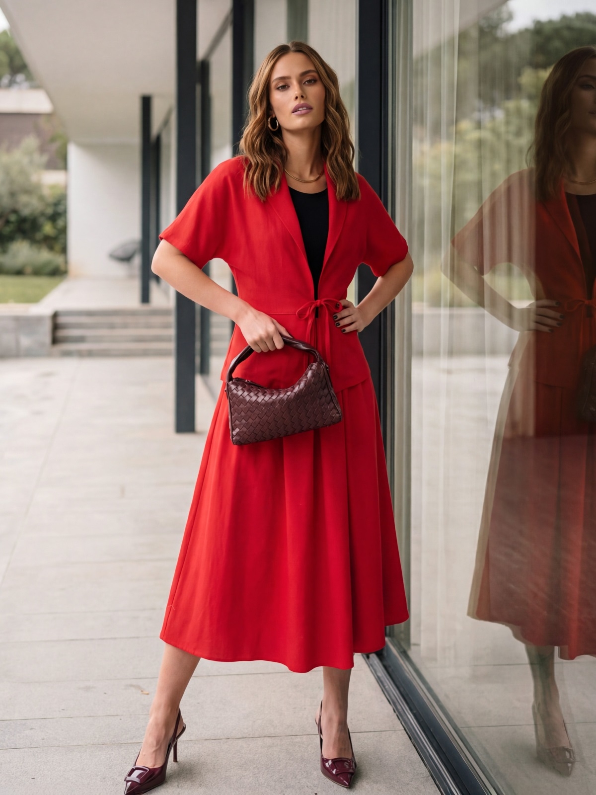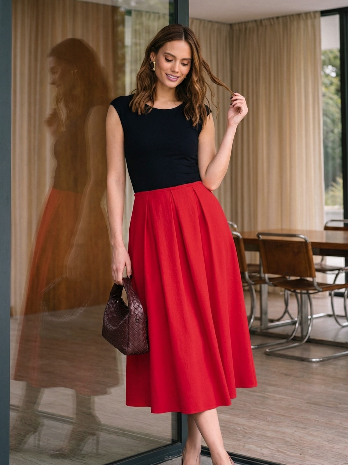 Модель добре поєднується з туфлями, босоніжками або балетками, а доповнити образ можна стриманими аксесуарами.
