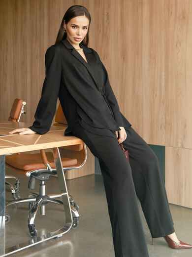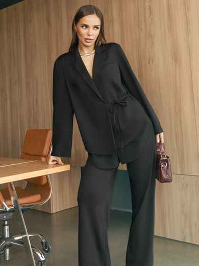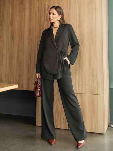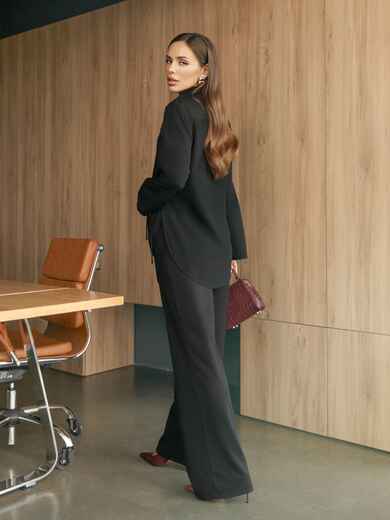 Оригінальний костюм-двійка. Верх з тканини Джерсі, з рукавами і внутрішньою частиною з креп-шифону, що формує багатошаровість. Фіксуються за допомогою зав'язок. Штани широкого крою. Еластичний пояс забезпечує зручність і практичність для носіння протягом дня. Для функціональності передбачені бічні кишені.