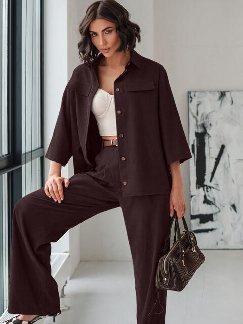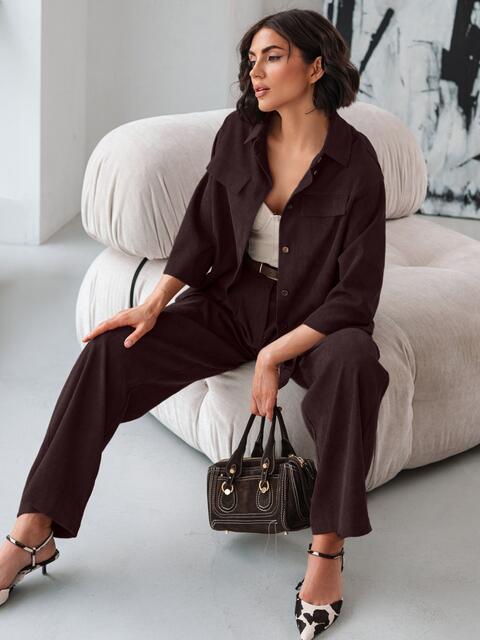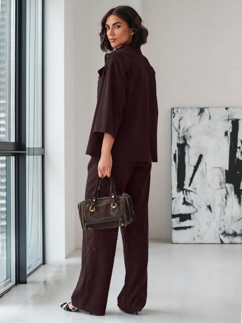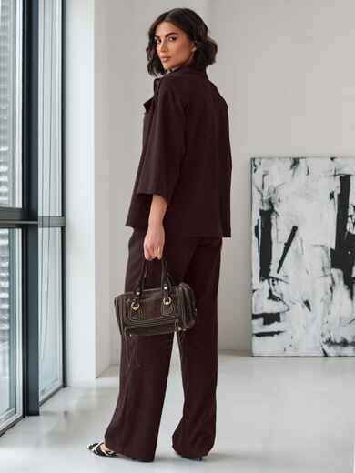 Костюм-двійка з мікровельвету. Сорочка з класичним коміром та рукавами ¾. Передня частина декорована клапанами. Застібається на ґудзики. Широкі штани із застібкою на блискавку та ґудзик. Пояс у комплект не входить.