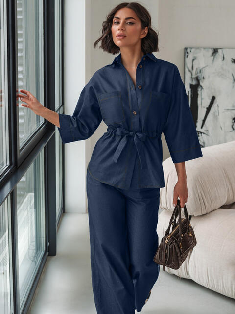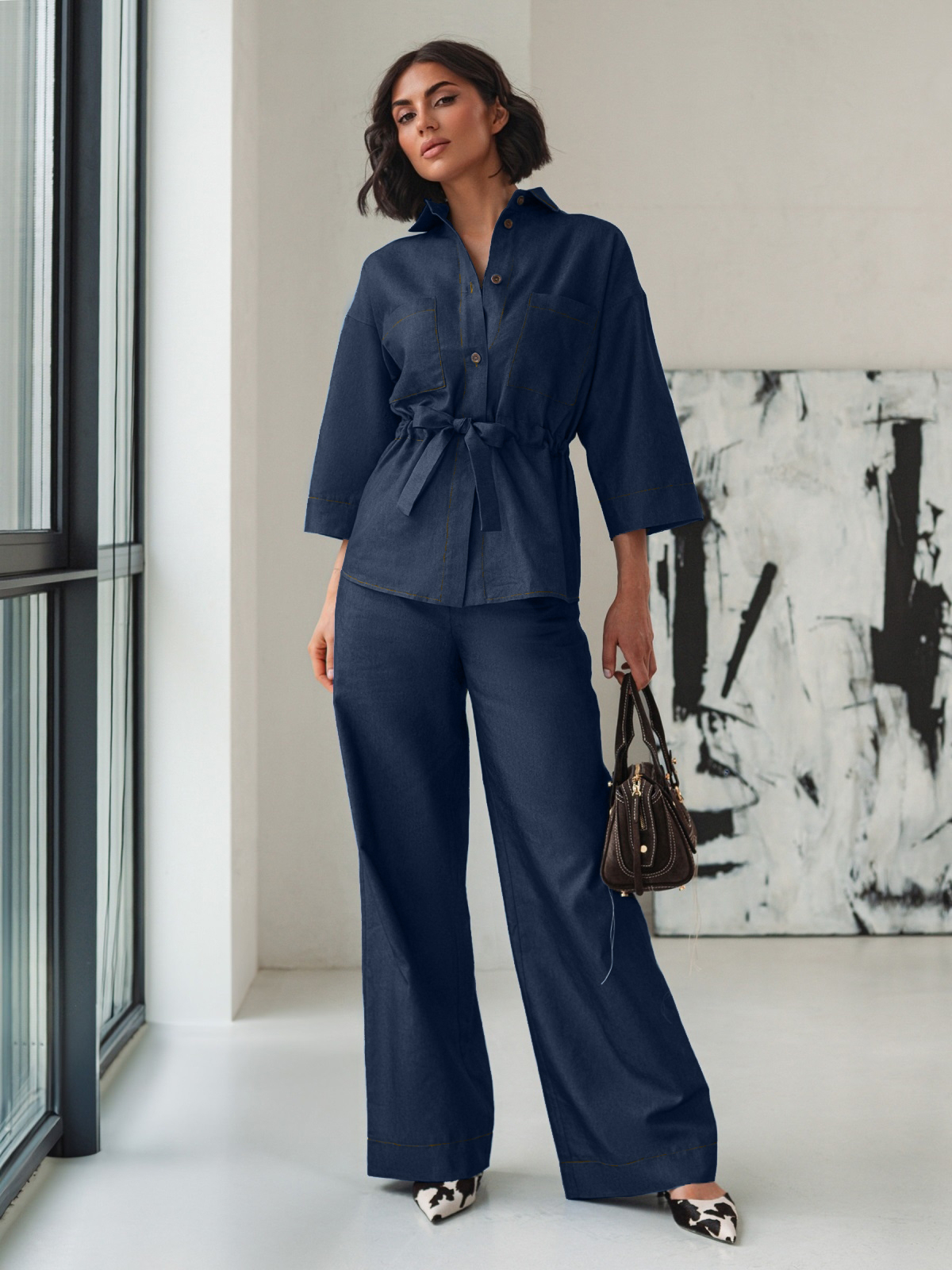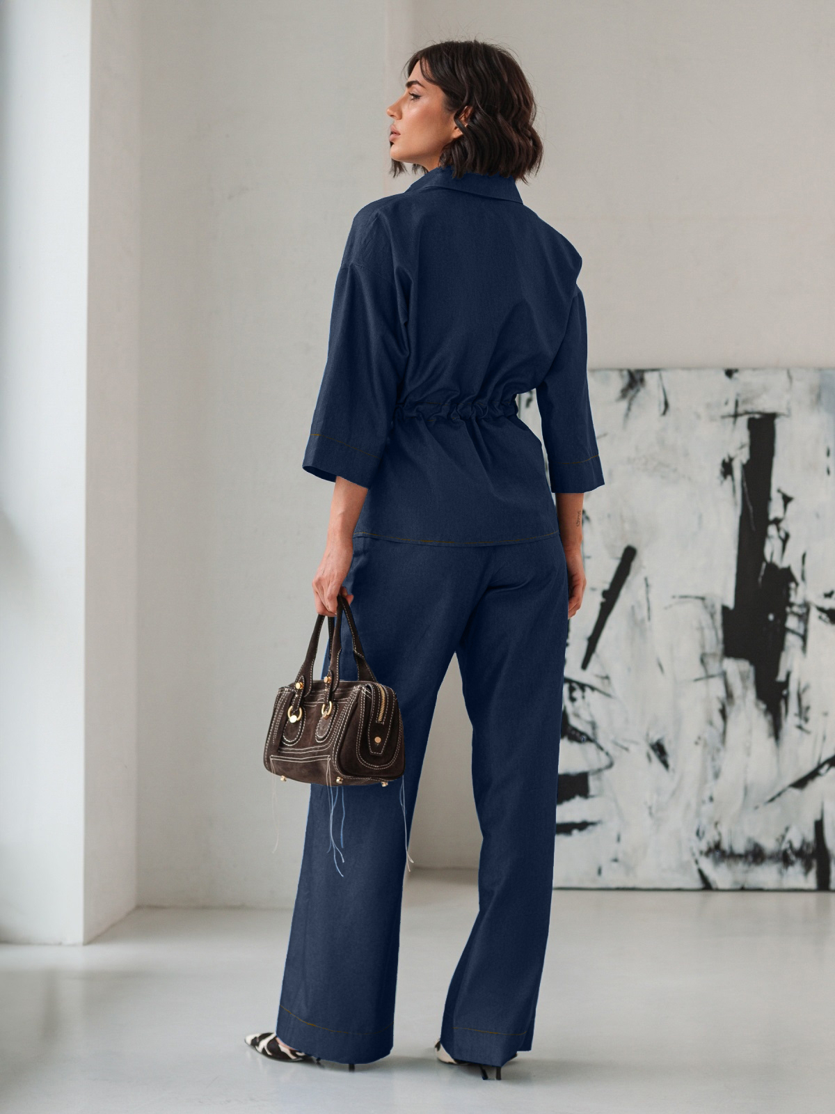 Костюм-двійка із полегшеного джинсу. Сорочка з рукавами ¾ і акцентним поясом-куліскою на талії. Доповнена накладними кишенями на поличці. Застібається на ґудзики. Прямі штани із застібкою на блискавку та ґудзик.