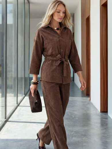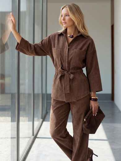 Костюм-двійка з мікровельвету. Сорочка з рукавами ¾ застібається на ґудзики. Доповнена накладними кишенями на поличці. Талія підкреслена куліскою з поясом. Прямі брюки із застібкою на блискавку і ґудзик.