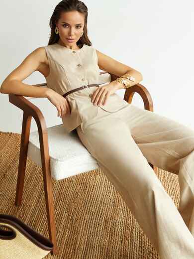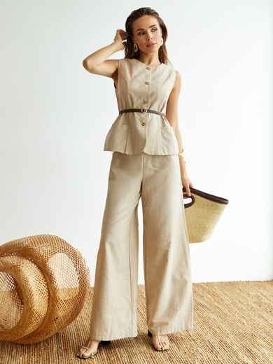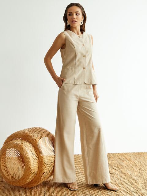 Костюм-двійка з льону для теплого сезону та активних днів. Жилет із круглим вирізом і застібкою на ґудзики підходить для багатошарових образів або самостійної носки. Широкі штани з еластичним поясом і кишенями забезпечують комфортну посадку та свободу рухів. Натуральна тканина приємна до тіла і дозволяє шкірі дихати.