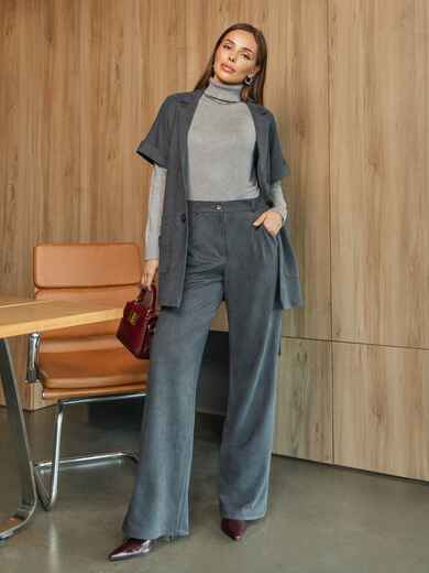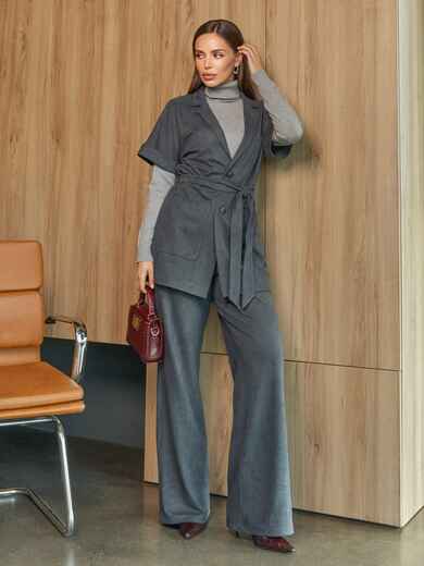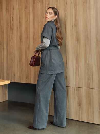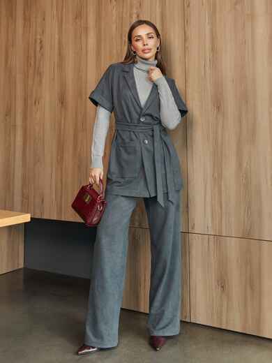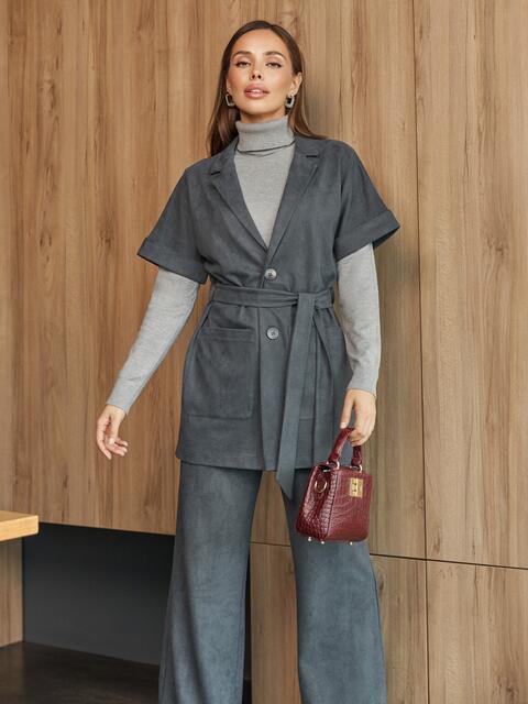 Костюм-двійка з фактурної замші. Подовжений жакет з рукавами-кімоно. Модель з класичними лацканами і накладними кишенями. Застібається на ґудзики. Підкреслити талію дозволяє текстильний пояс у комплекті. Штани широкого крою. Висока посадка візуально подовжує ноги. Збоку розташовані прорізні кишені, що додають функціональності. Вшитий пояс доповнений шлевками. Застібаються на блискавку і ґудзик.