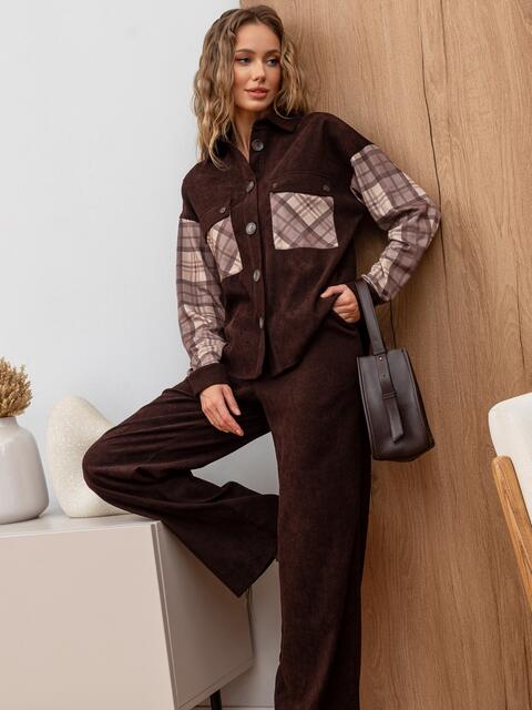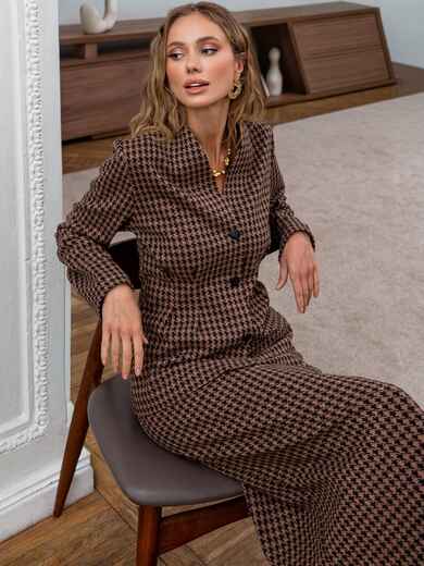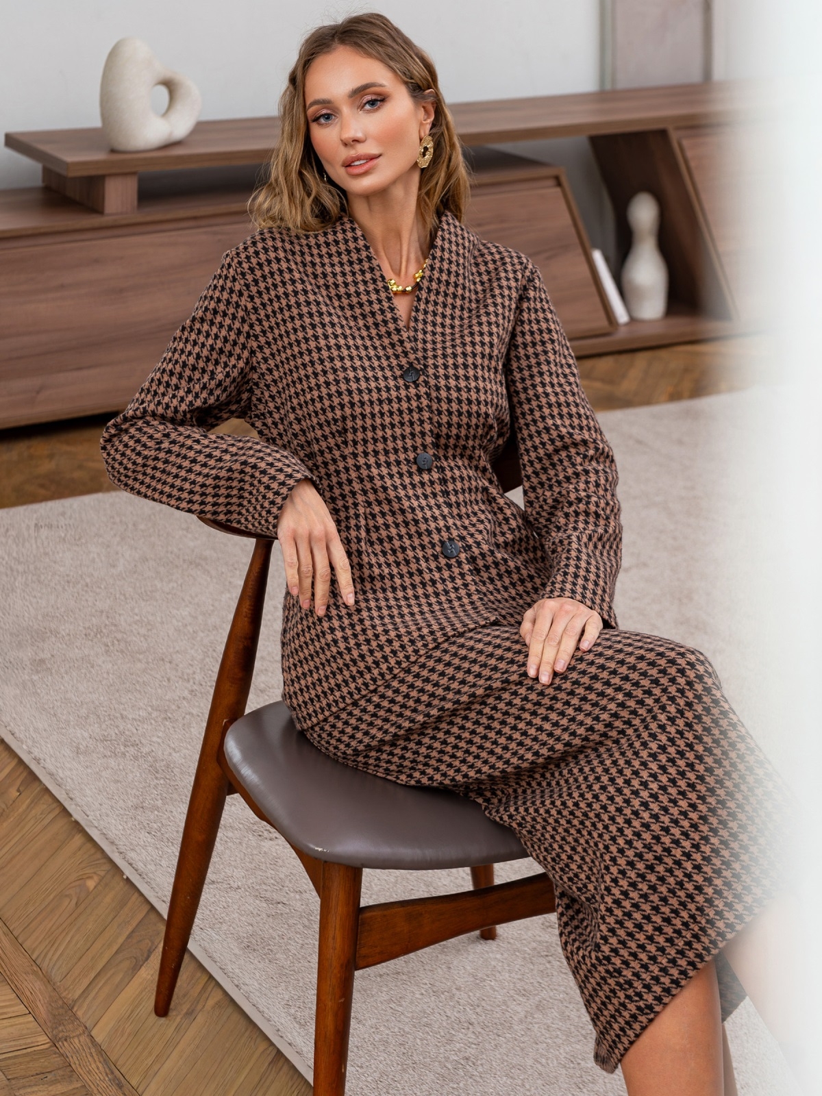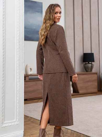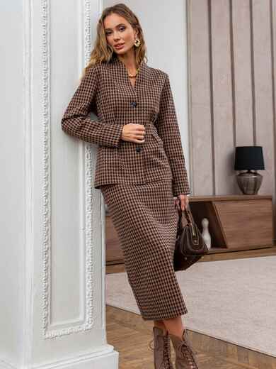 Елегантний костюм з м'якого трикотажу. Напівприталений жакет застібається на гудзики. М'які складки попереду надають стрункості фігурі. Спідниця прямого крою. Для комфорту в носінні ззаду зроблений розріз. Застібається на блискавку.