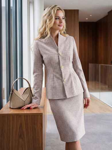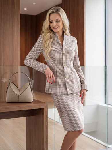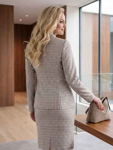 Костюм з костюмної тканини. Напівприталений жакет застібається на гудзики. Спідниця прямого крою з розрізом ззаду. Застібається на блискавку.