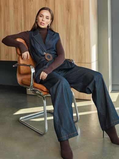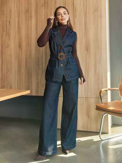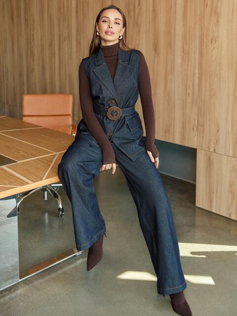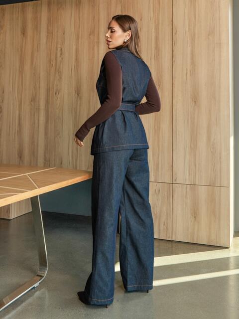 Костюм-двійка з деніму. Жилет із лацканами, застібка на ґудзики. Клапани на передній частині додають структури. Штани прямого крою застібаються на блискавку і ґудзик. Талія доповнена шльовками. Збоку розташовані прорізні кишені. Комплектується поясом із основного матеріалу із пряжкою.