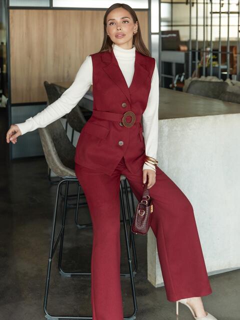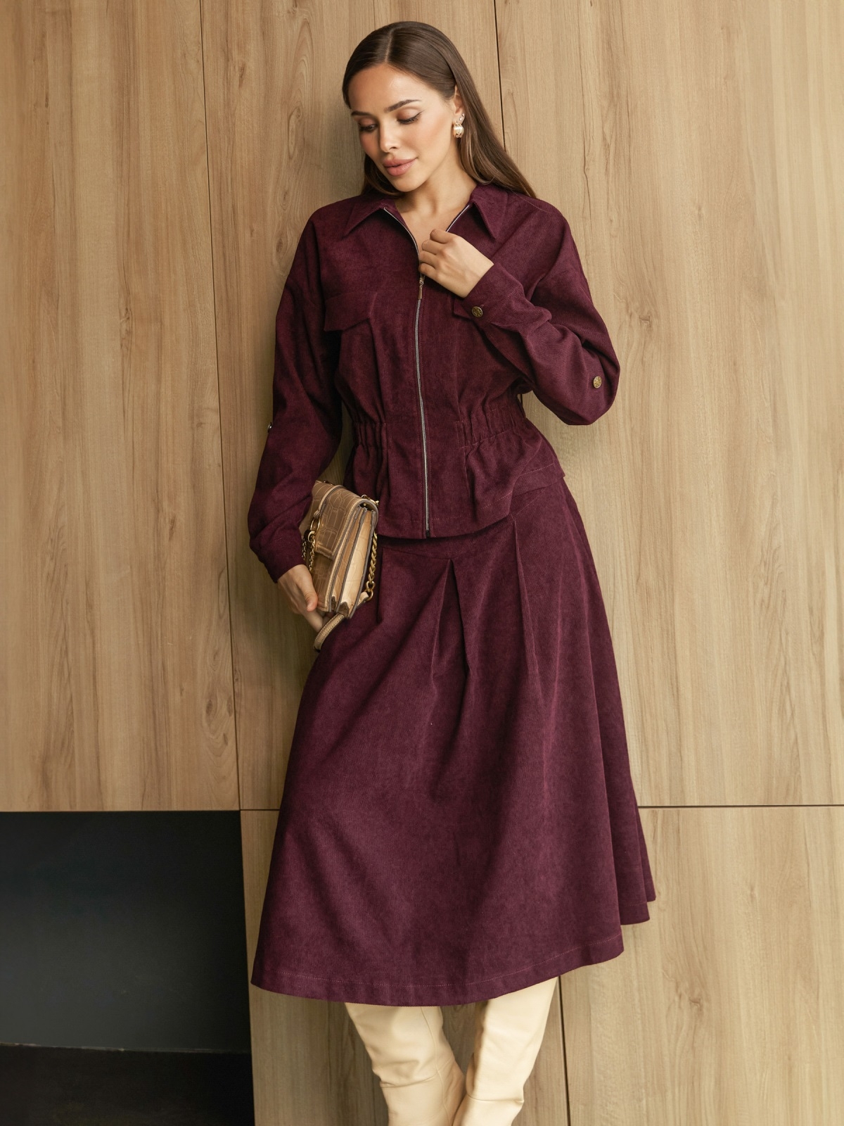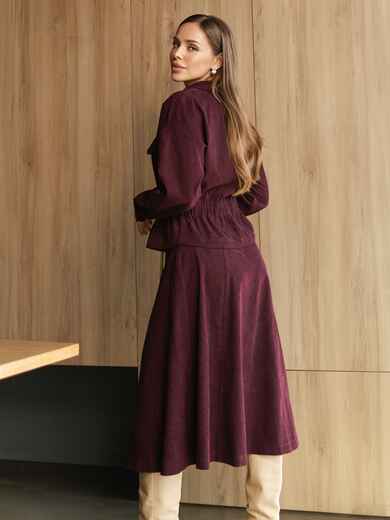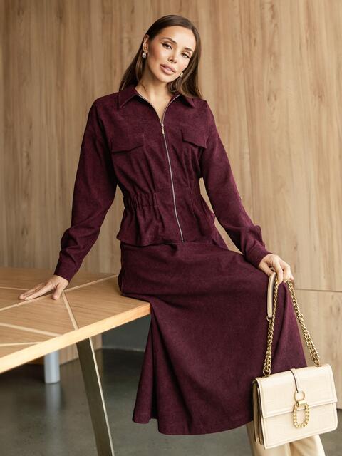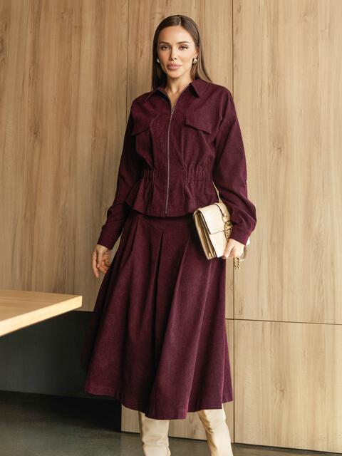 Костюм-двійка з мікровельвету. Жакет з акцентною талією за рахунок гумки. Модель з відкладним коміром. Довгі рукави зі спущеною лінією плечового шва, манжетами із застібкою на ґудзик і патом з шльовкою. Поличка доповнена клапанами. Застібається на блискавку. Спідниця міді А-силуету. Модель з м'якими складками спереду. Застібається на блискавку.