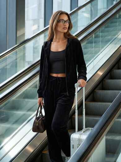 Костюм-двійка з турецького велюру. До комплекту входять кофта та штани. Верх вільного крою з капюшоном, застібається на блискавку по всій довжині. Довгі рукави з манжетами. Спереду дві кишені. Штани прямого крою з широкою гумкою на талії та двома бічними кишенями.