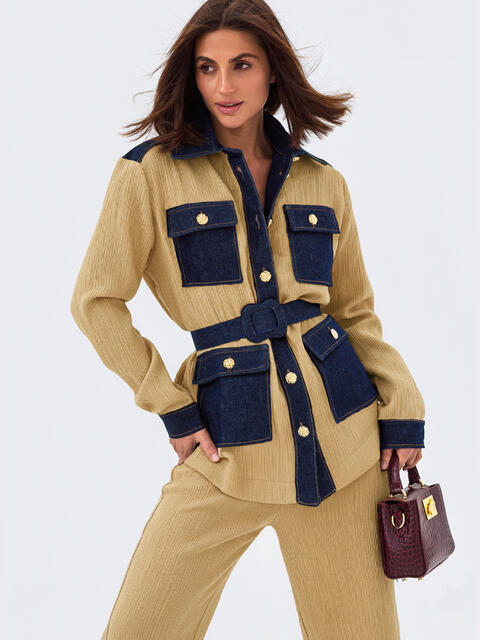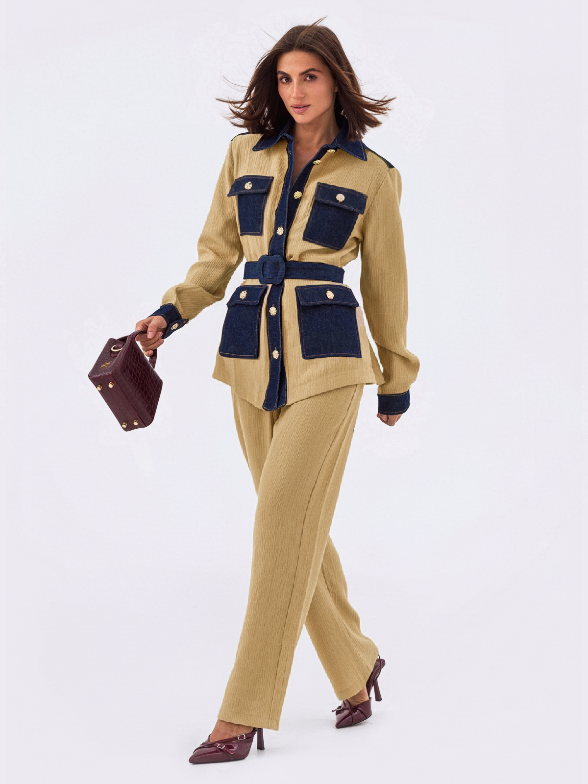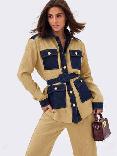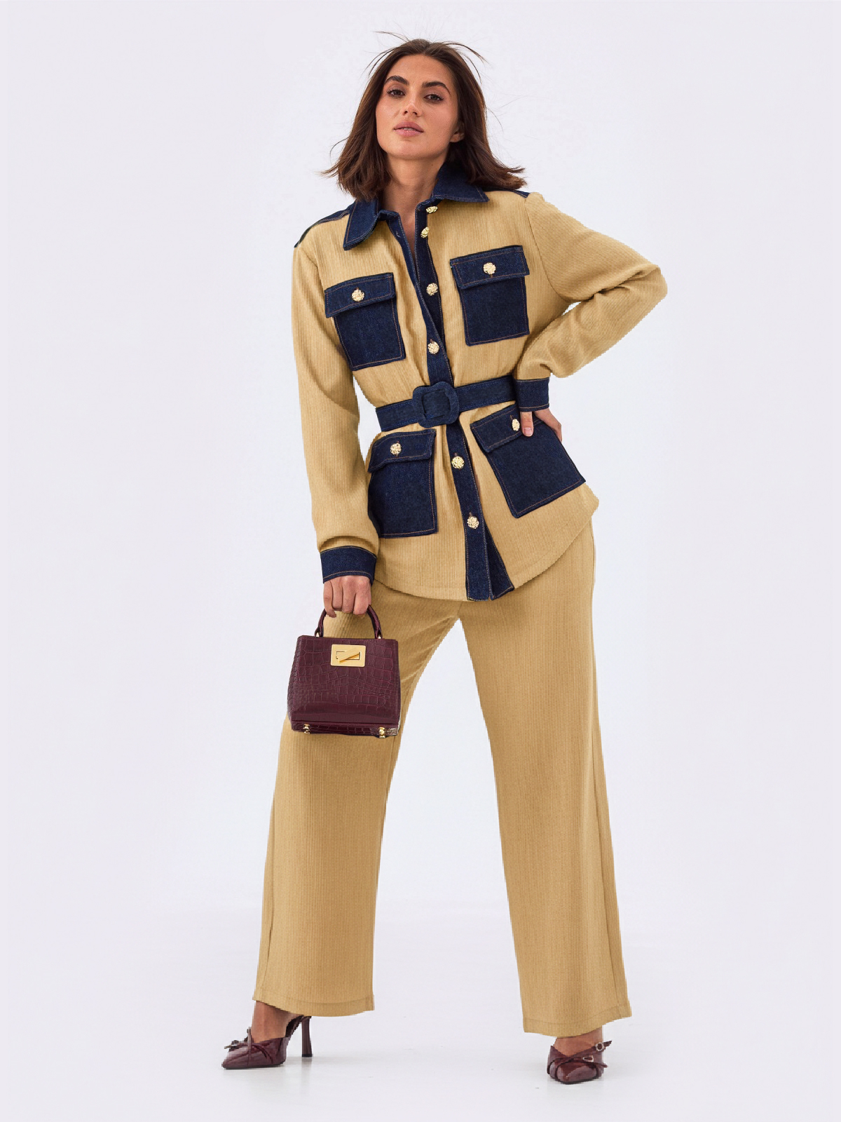 Костюм-двійка вільного крою із високоякісного турецького матеріалу. Сорочка з джинсовими вставками на плечах, у вигляді коміра, манжет та кишень із клапанами. Застібається на ґудзики за планкою. Комплектується поясом із пряжкою. Широкі штани з талією на резинці. Доповнені кишенями.