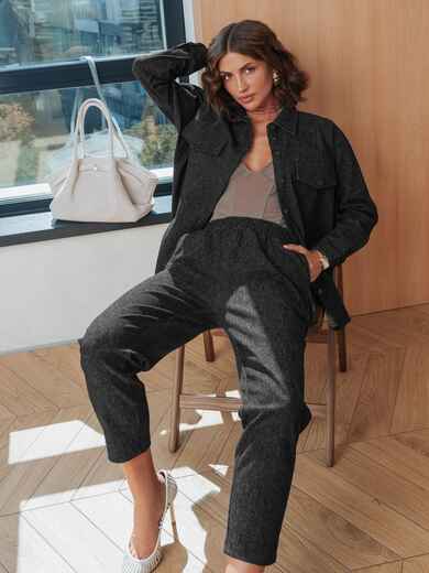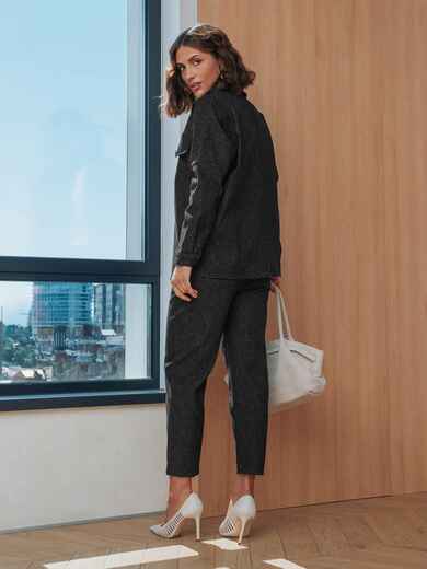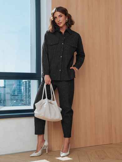 Костюм-двійка з високоякісного турецького матеріалу. Сорочка прямого крою із застібкою на ґудзики. Спущені рукави забезпечують свободу рухів, а манжети на ґудзиках фіксують їх. На грудях розташовані декоративні клапани, що імітують кишені. З боків виробу розрізи для додаткового комфорту. Штани завужені до низу. З бічними кишенями і поясом на гумці.