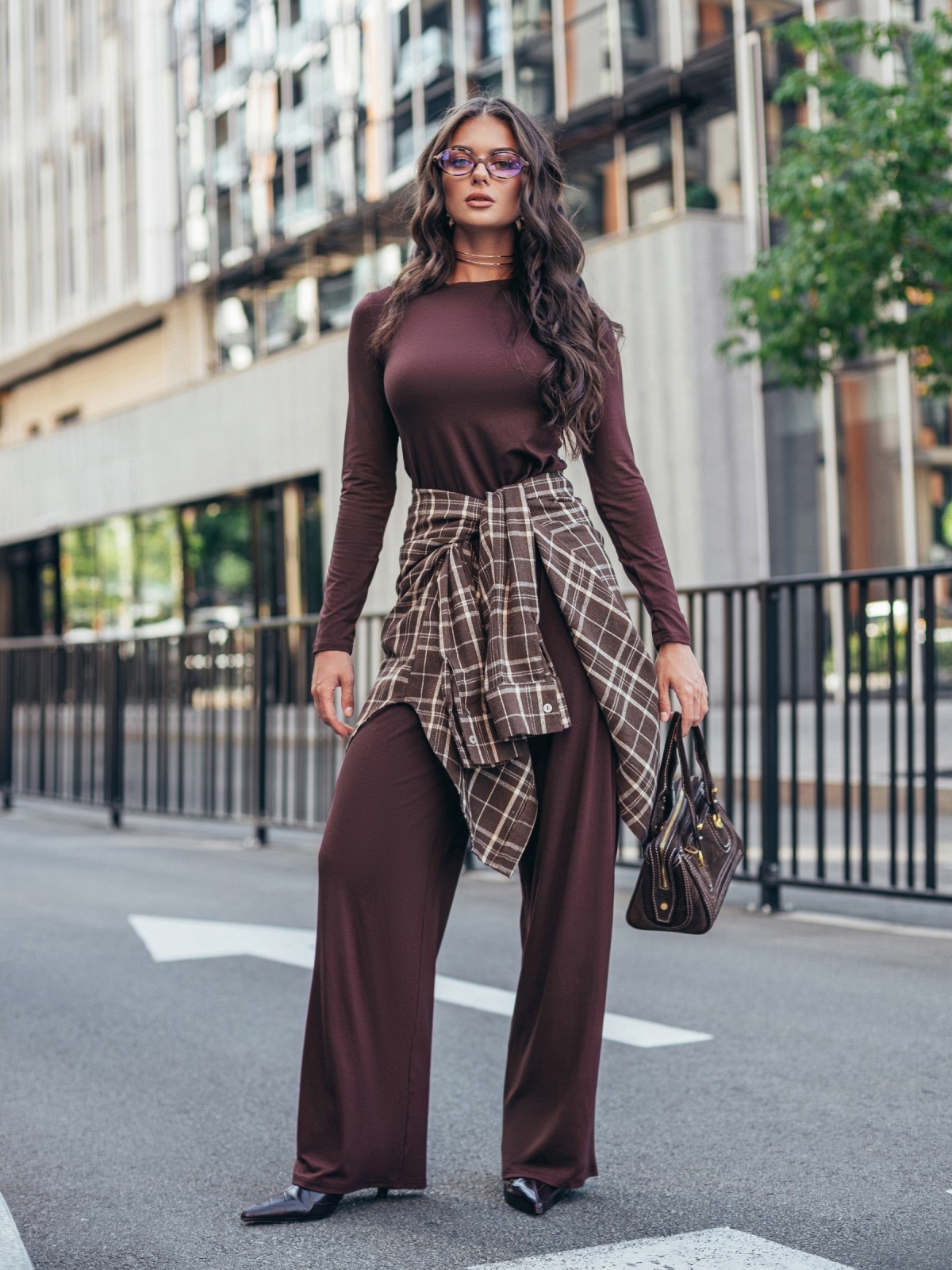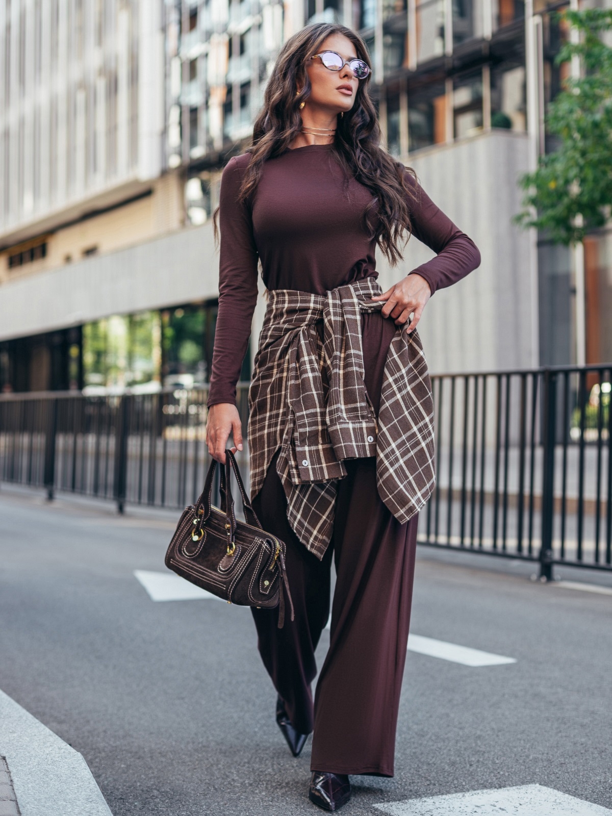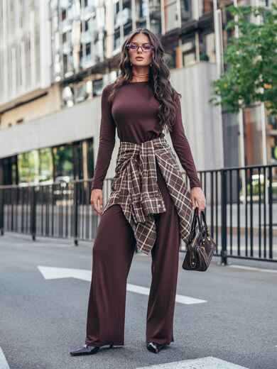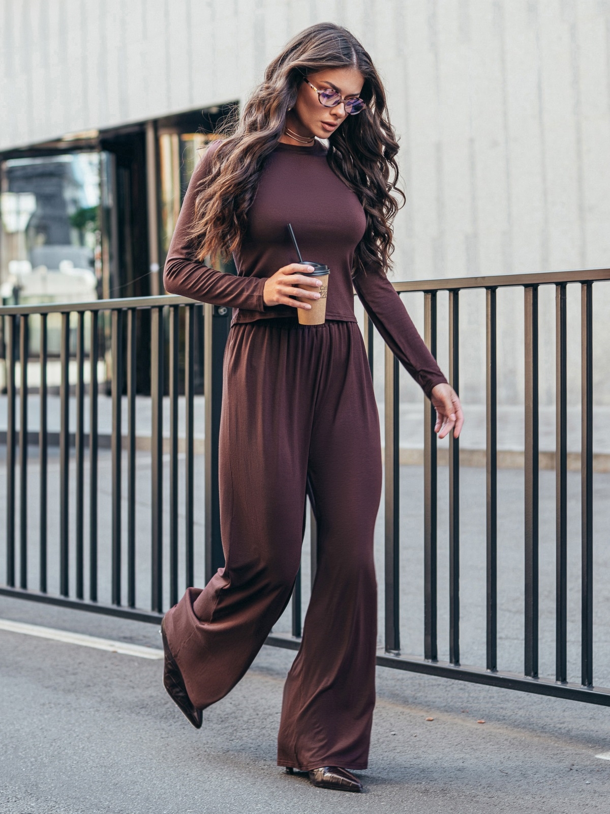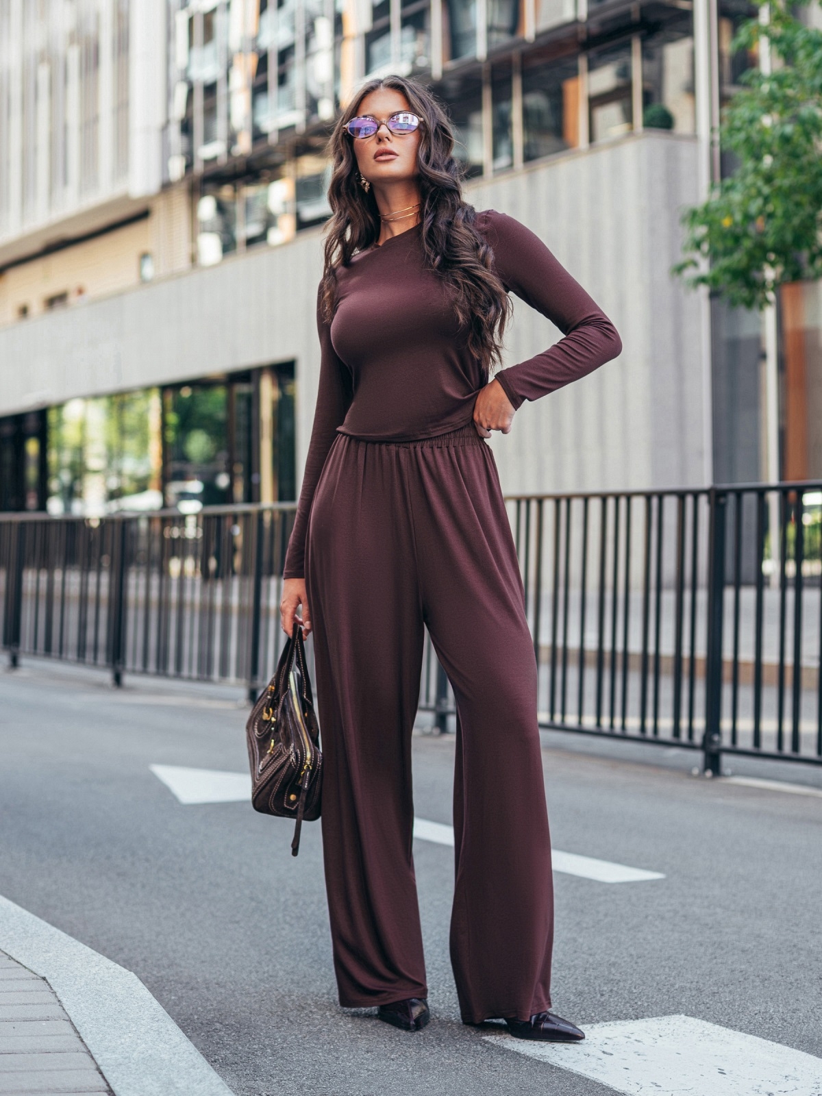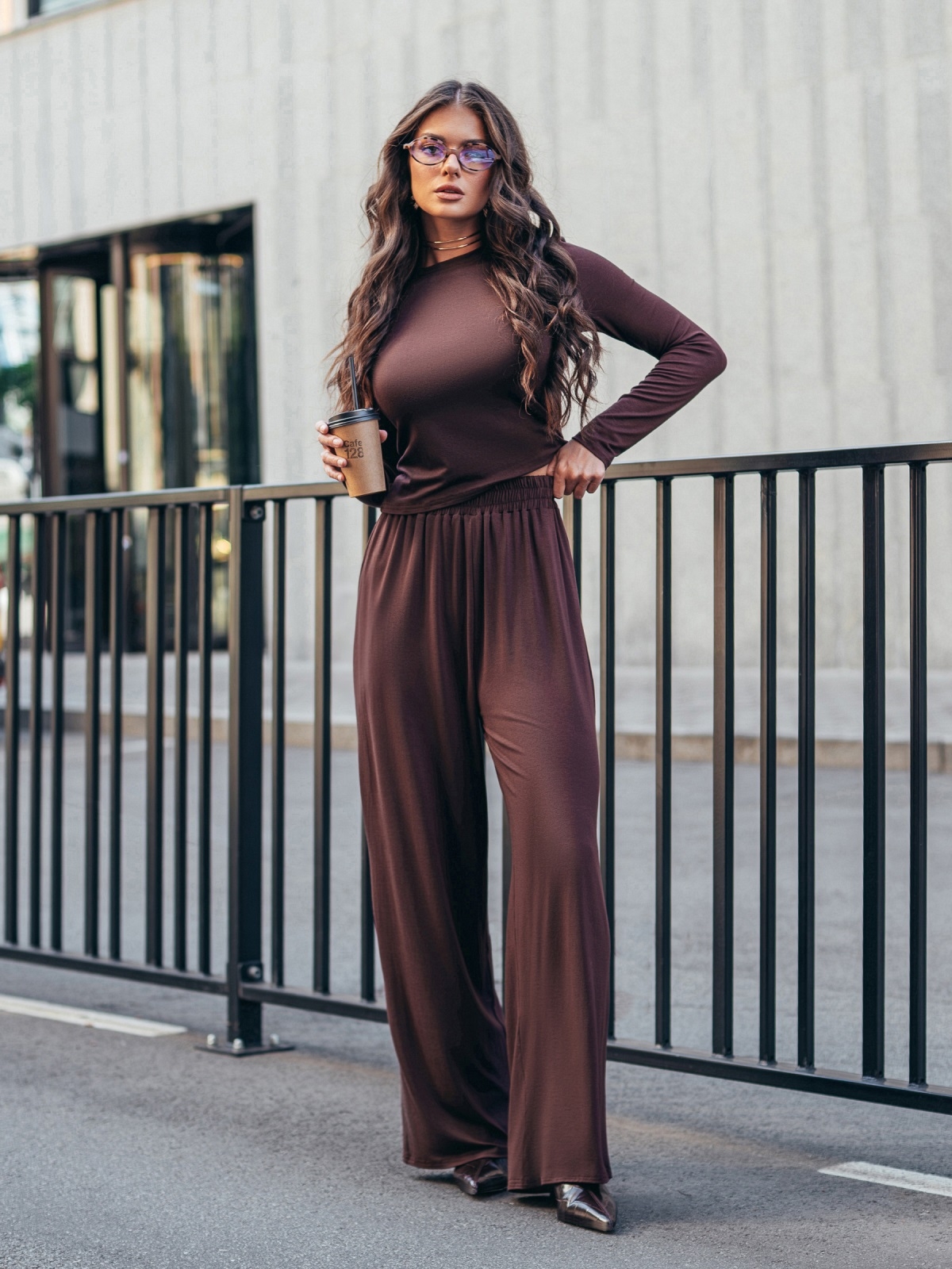 Практичний та стильний костюм з віскози. Класичний лонгсліва з круглим вирізом горловини та довгими рукавами. Модель приталеного силуету, що підкреслює фігуру. Широкі брюки палаццо з високою посадкою візуально подовжують силует. Еластичний пояс забезпечує комфортну посадку і не сковує рухів.