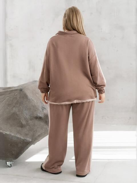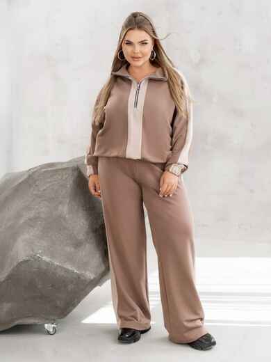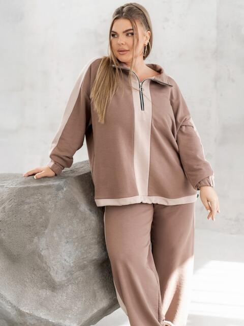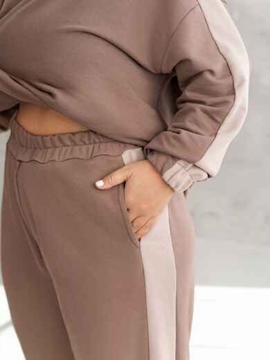 Костюм-двійка з трикотажу трьохнитка-петля люкс-якості виробництва Туреччини. Тканина гарантує високу зносостійкість і не кошлатиться. Кофта зі спущеною лінією плечового шва. З вертикальними вставками спереду і на рукавах. Невеликий комір-стійка в поєднанні з блискавкою додають зручності. Куліска знизу забезпечує комфортну посадку, дозволяючи коригувати об'єм і довжину виробу, перетворюючи з прямої в злегка приталену. Штани вільного крою з лампасами. Еластичний пояс забезпечує комфортну посадку. Доповнені функціональними кишенями.