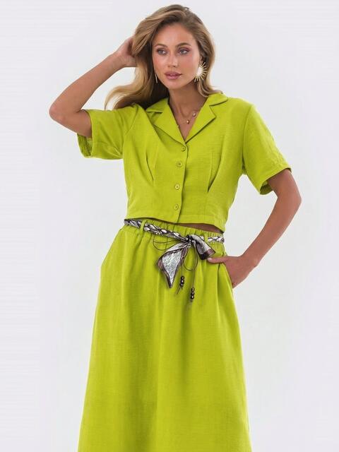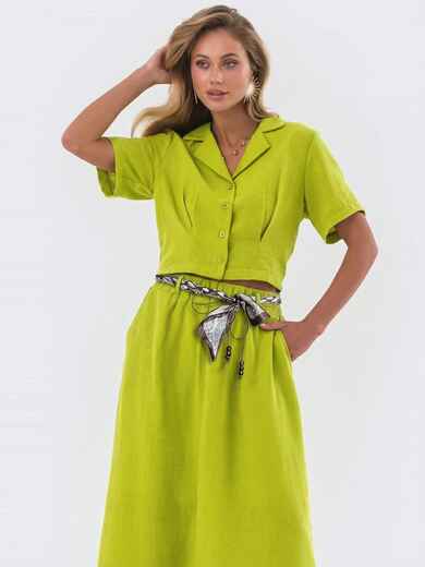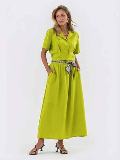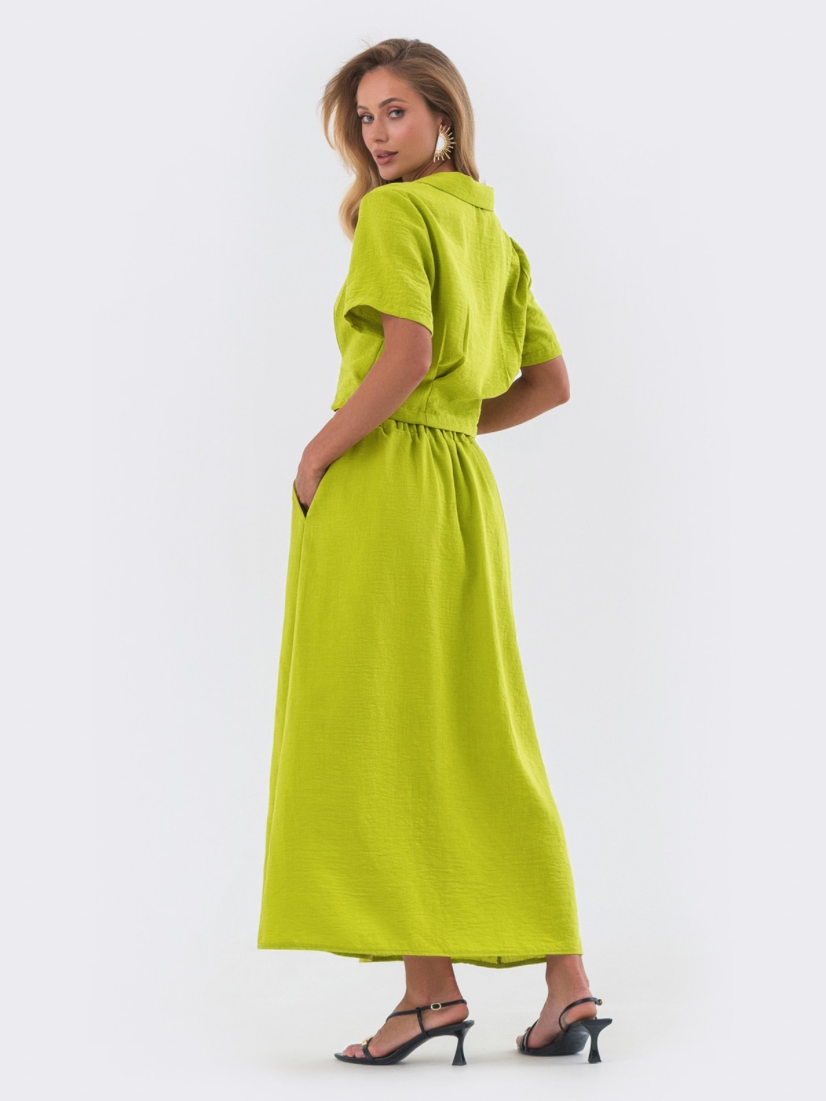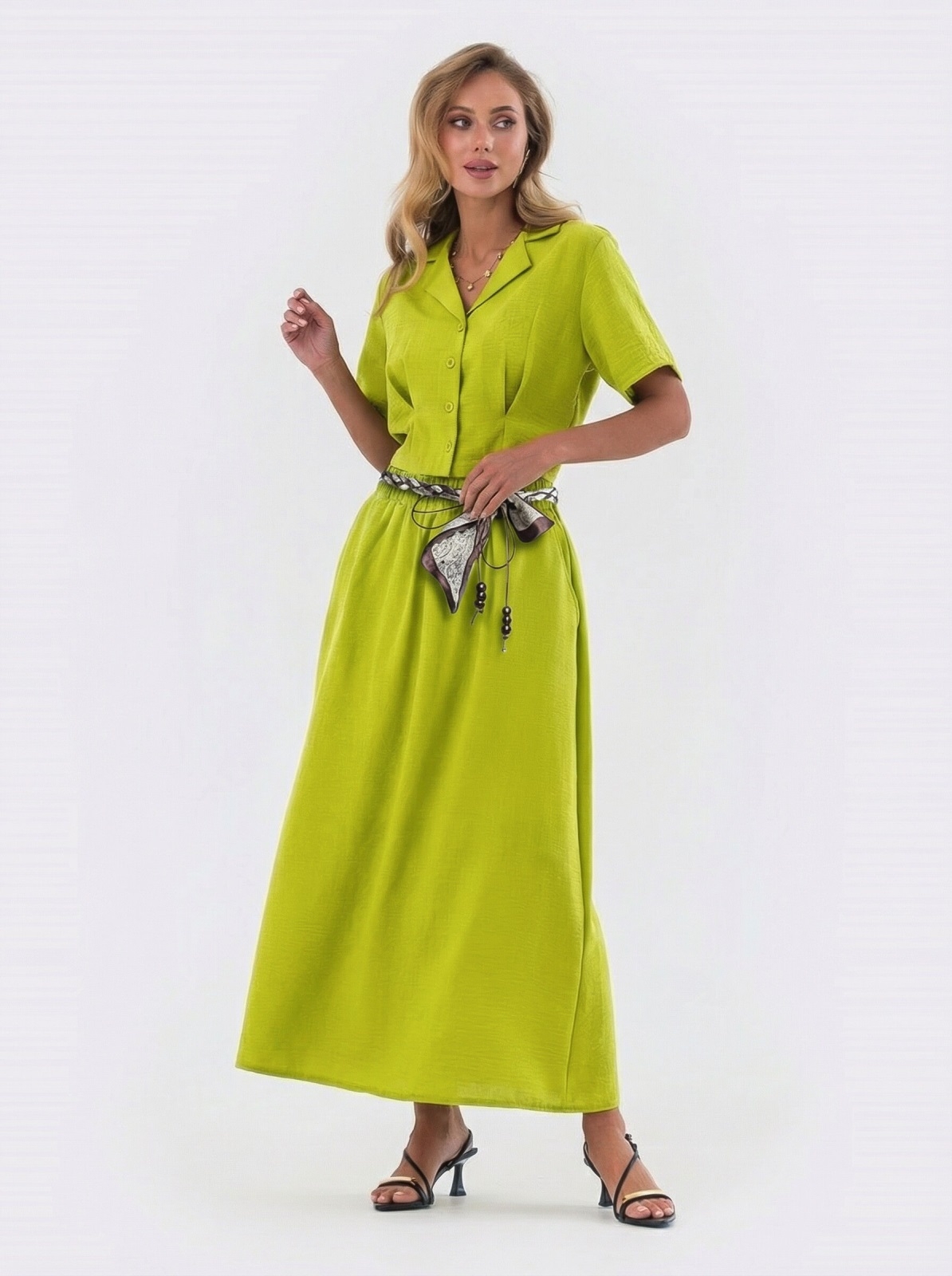Яскравий костюм-двійка лаймового кольору з турецького матеріалу стане акцентом літнього гардероба. Поєднання блузки з відкладним коміром та довгої спідниці створює стильний casual образ.