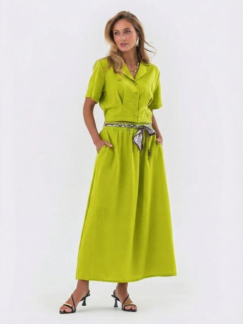 Костюм-двійка з турецького матеріалу приємний на дотик та в носці. Блузка вкороченого крою та спідниця максі доповнені поясом з контрастним принтом, який оживляє монохромний образ.