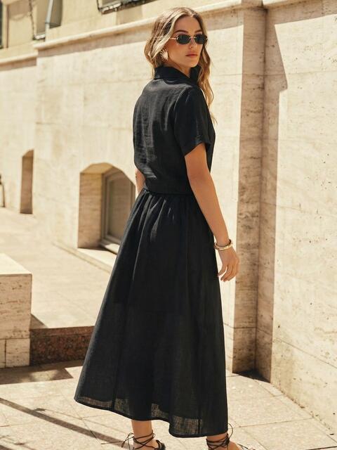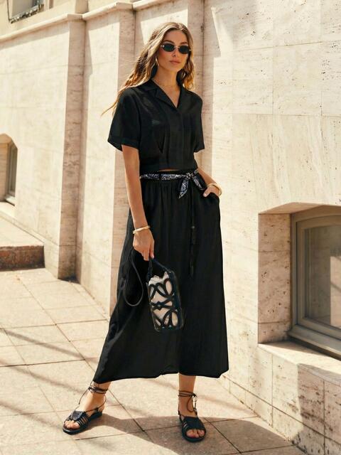 Верх вільного крою, з відкладним коміром та застібкою на ґудзики. З короткими рукавами. Спідниця доповнена бічними кишенями, талія на гумці зі шльовками.