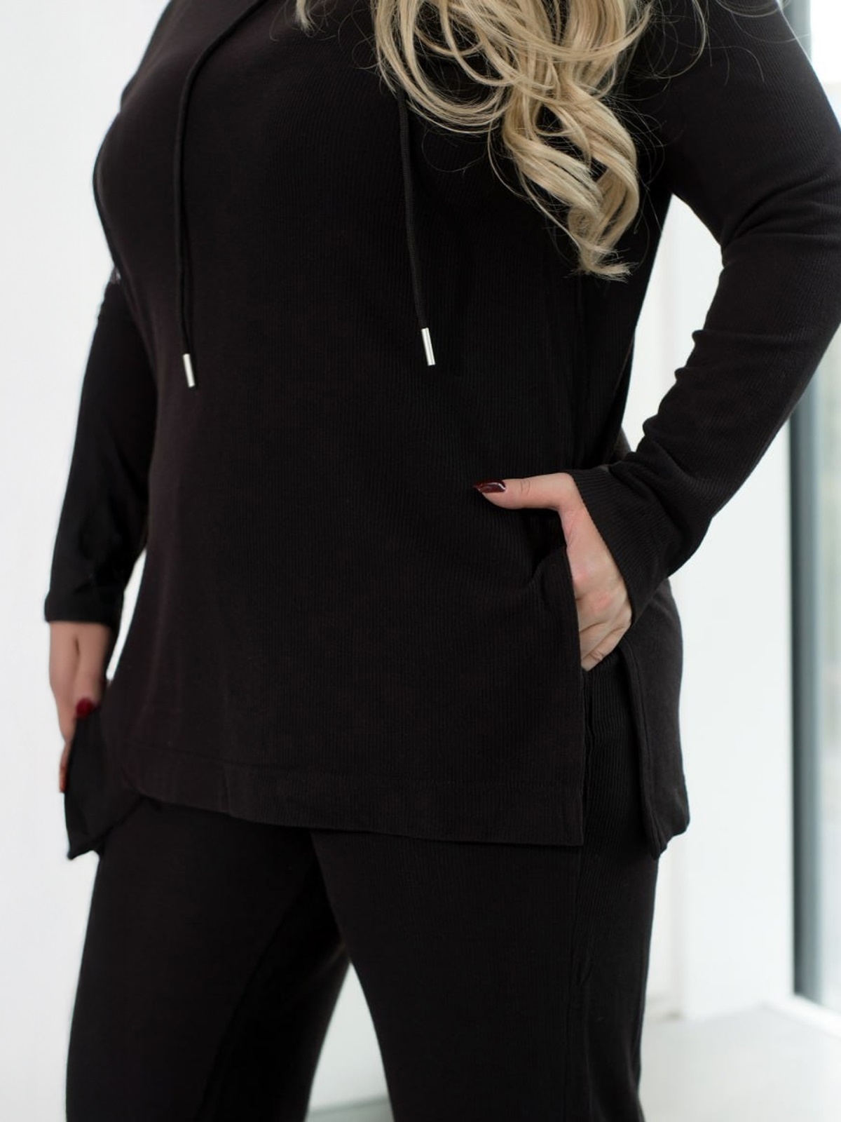 Брючний костюм-двійка на кожен день. Модель із ангори "рубчик". Верх у стилі оверсайз із капюшоном на зав'язках. Штани-палаццо з кишенями з боків. По талії розташована гумка.