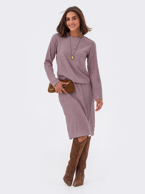 В'язаний костюм із "косами". Джемпер з круглою горловиною та спущеним плечем. Спідниця прямого крою з талією на резинці.