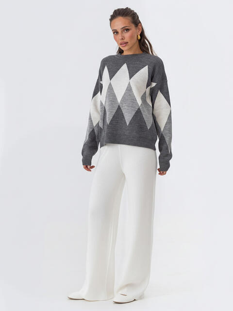 Стильний в'язаний костюм. Об'ємний светр з високим коміром. Крій oversize і спущена лінія плеча забезпечують комфортну посадку. Манжети і низ виконані еластичною гумкою. Спідниця в техніці гофре, що створює текстуру, яка елегантно рухається. Модель з високою талією і еластичним поясом-гумкою для максимального комфорту.