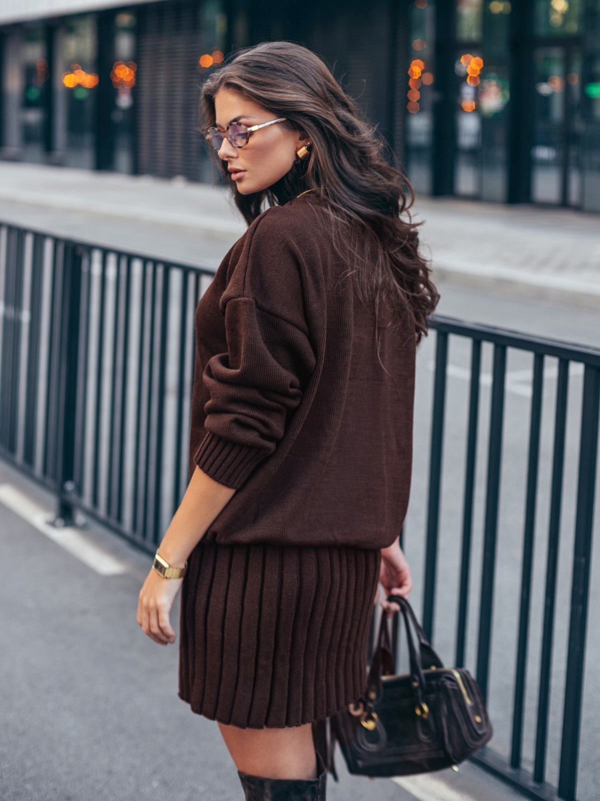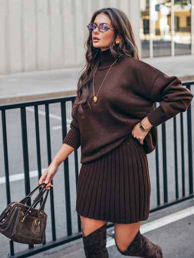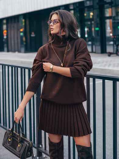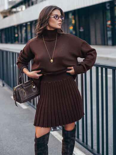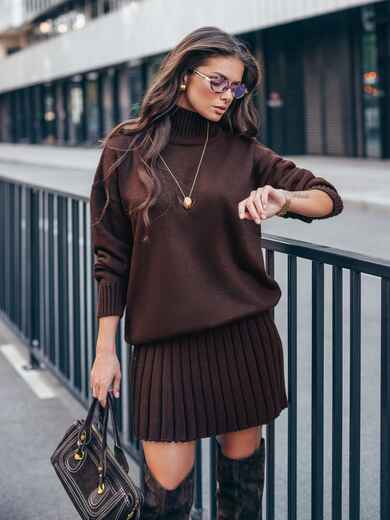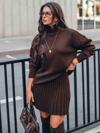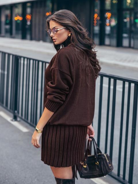 Стильний в'язаний костюм. Об'ємний светр з високим коміром. Крій oversize і спущена лінія плеча забезпечують комфортну посадку. Манжети і низ виконані еластичною гумкою. Спідниця в техніці гофре, що створює текстуру, яка елегантно рухається. Модель з високою талією і еластичним поясом-гумкою для максимального комфорту.