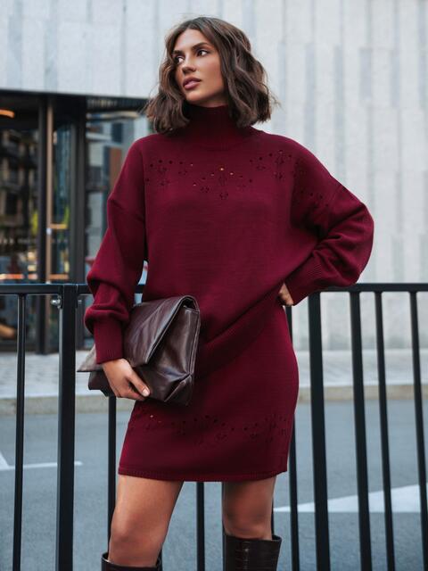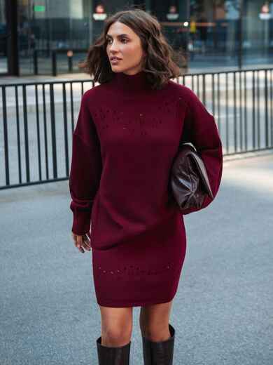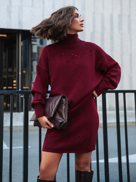 Костюм дрібної в'язки з високоякісного турецького матеріалу. Светр з високою горловиною і довгими рукавами. Коротка спідниця з талією на гумці. Виріб декорований перфорацією.
