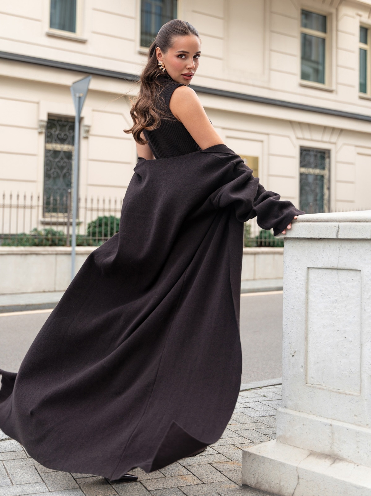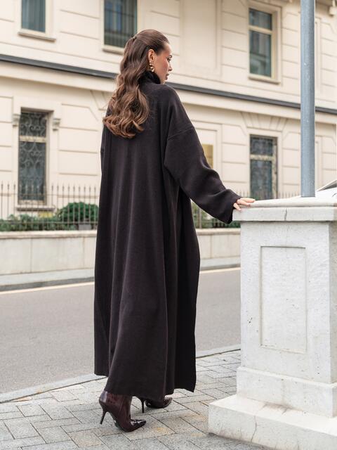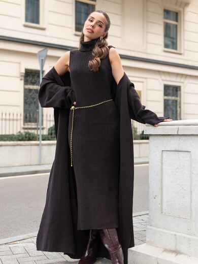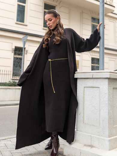 В'язаний костюм з високоякісного турецького матеріалу. Довгий кардиган вільного крою з довгими рукавами. Без застібки. Сукня-міді в рубчик з високим коміром і без рукавів. Прилеглягаючий силует підкреслює фігуру. Рекомендований на зріст 170-175 см.
