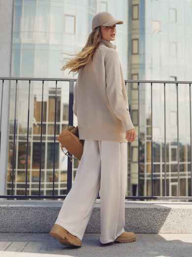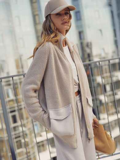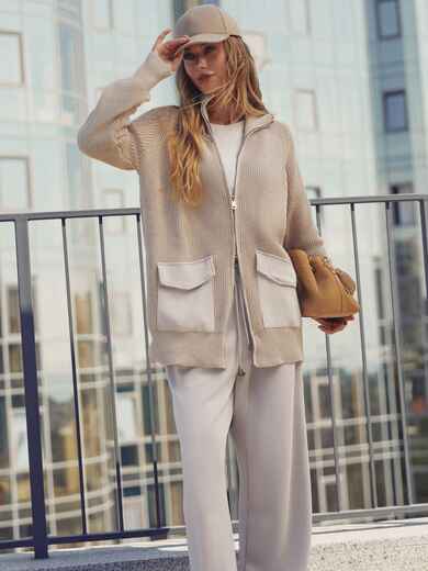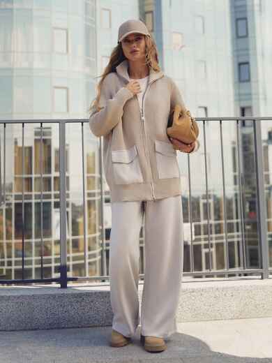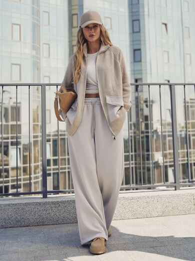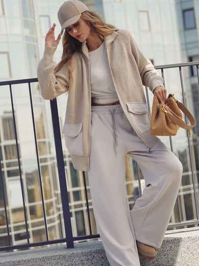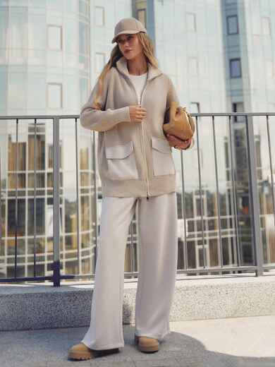 В'язаний костюм з високоякісного турецького матеріалу. Кофта (70% бавовна, 30% поліестер) зі спущеною лінією плеча. Застібається на блискавку по всій довжині. Дві великі накладні кишені з контрастного матеріалу спереду додають функціональності. Штани (100% бавовна) прямого, широкого крою з талією на гумці і додатковим шнурком для регулювання. Бічні кишені в швах роблять їх зручними.