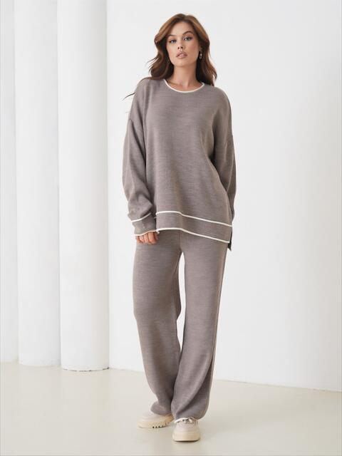 В'язаний костюм з високоякісного турецького матеріалу. Кофта (70% бавовна, 30% поліестер) зі спущеною лінією плеча. Застібається на блискавку по всій довжині. Дві великі накладні кишені з контрастного матеріалу спереду додають функціональності. Штани (100% бавовна) прямого, широкого крою з талією на гумці і додатковим шнурком для регулювання. Бічні кишені в швах роблять їх зручними.