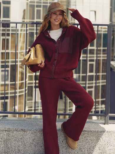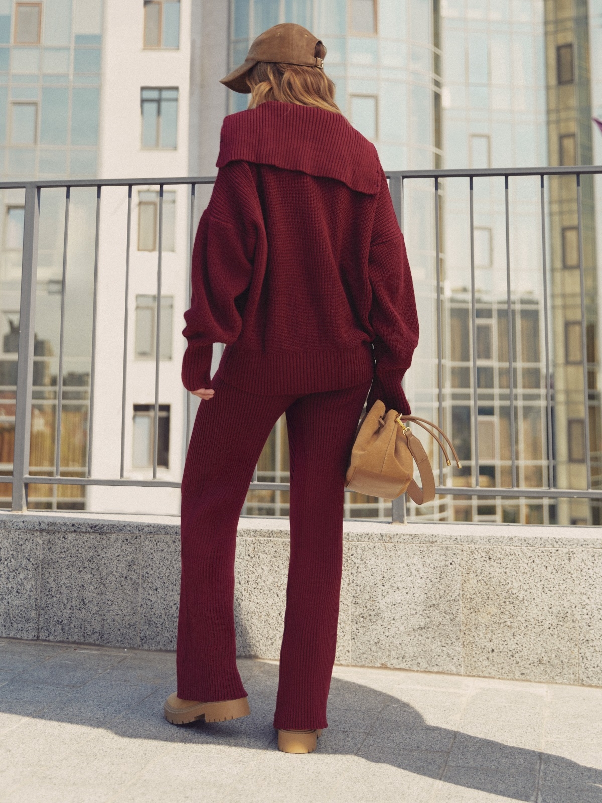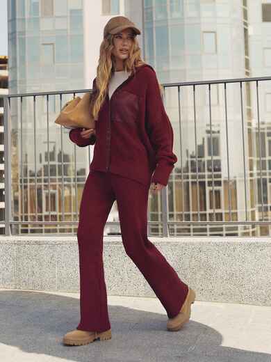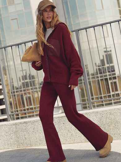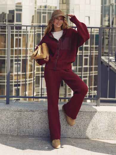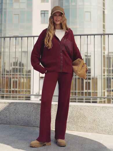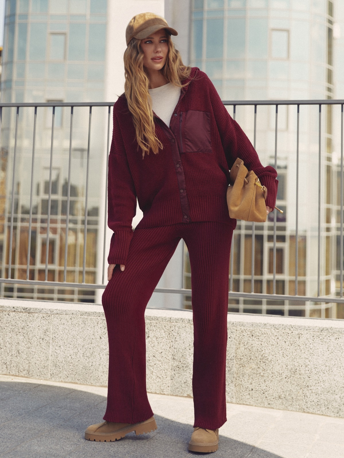 Костюм щільної в'язки з високоякісного турецького матеріалу. Верх зі спущеним плечовим швом і високим коміром. Особливість виробу - накладні кишені з плащової тканини з функціональною блискавкою. Широкі манжети і низ на гумці для комфортної посадки. Застібка на кнопки по всій довжині дозволяє носити його як самостійний елемент або як верхній шар. Штани прямого крою візуально подовжують силует. Талія на гумці.