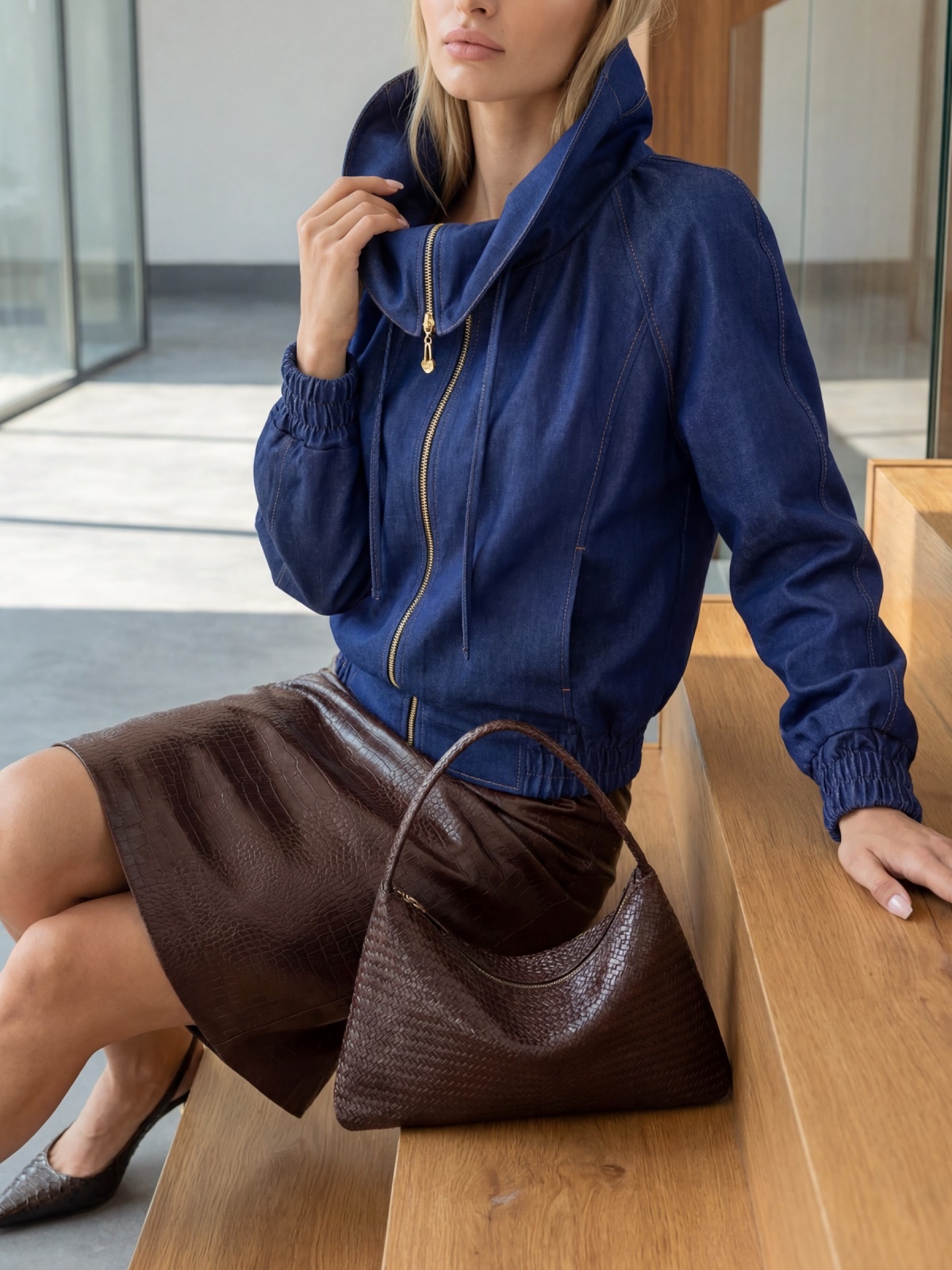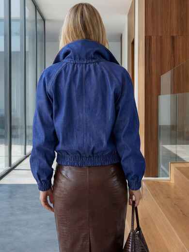 Джинсова куртка-бомбер з високим коміром на кулісці. Рукав реглан з широким еластичним манжетом. Низ виробу також оформлений гумкою. З боків розташовані функціональні кишені. Застібається на металеву блискавку.