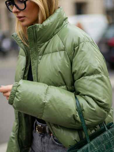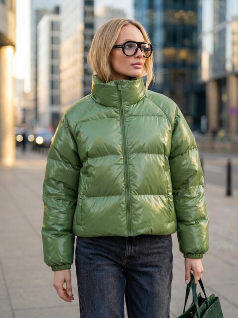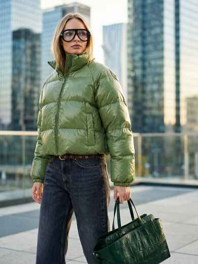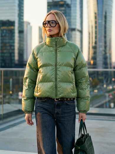 Демісезонна куртка з лакованої плащової тканини. Матеріал має більш інтенсивний блиск, ніж звичайні глянцеві тканини, що робить образ максимально виразним. Високий комір-стійка і еластичні манжети на рукавах забезпечують надійний захист від вітру. Модель з рукавом-реглан забезпечує свободу рухів і зручну посадку. Застібається на блискавку. Наповнювач – біопух. Підходить для погоди з температурою до -5°C.