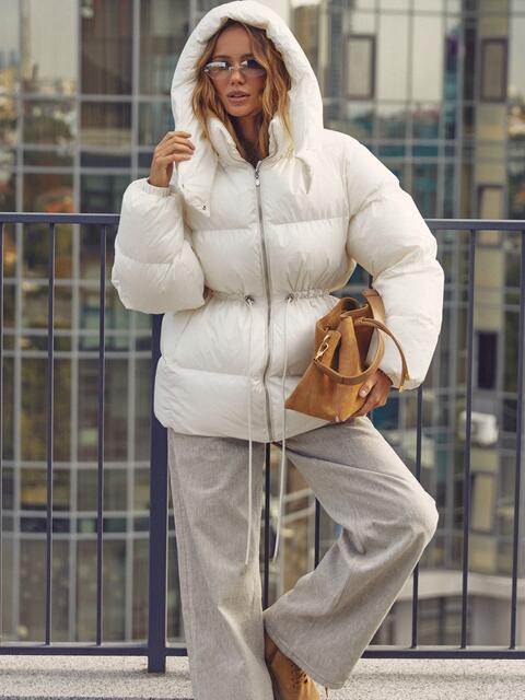 Зимова куртка у стилі оверсайз. Виріб з високим коміром та вшитим капюшоном на зав'язках. Доповнена прорізними кишенями. Низ по спинці доповнений резинкою. Застібається на блискавку з двома бігунками. Виріб із термопідкладом. Утеплювач - термолофт біопух.
