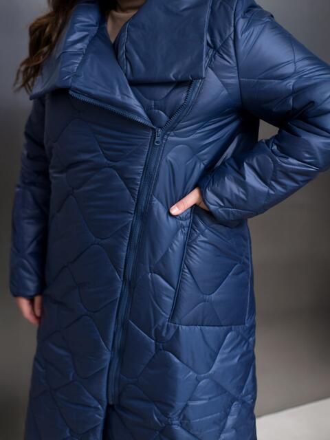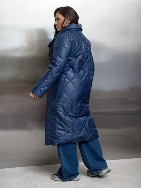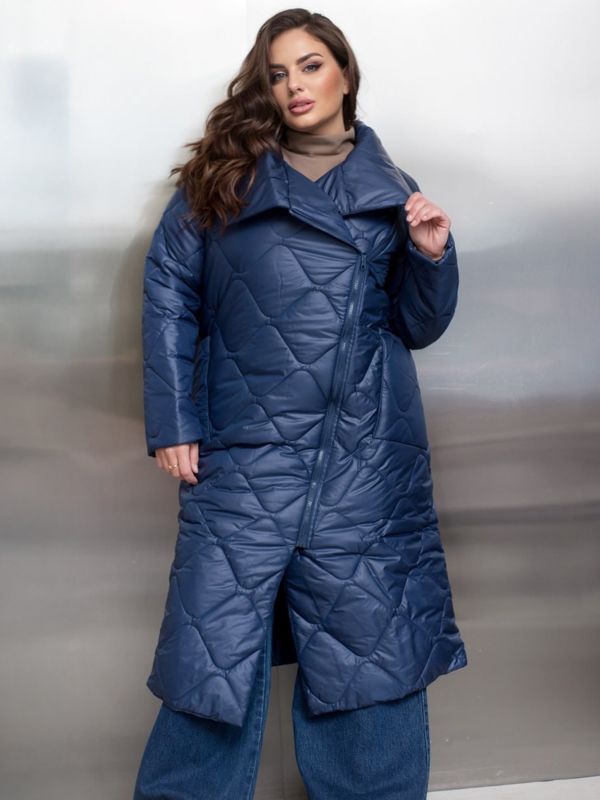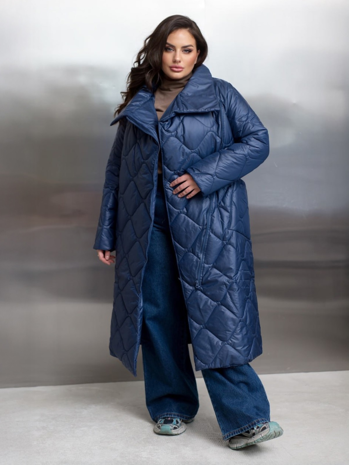Повсякденна стьобана куртка довжини міді. Виріб із високим коміром. Для комфорту в носці доповнена великими накладними кишенями. Застібається на косу блискавку. Модель на підкладці. Утеплювач – синтепон, силікон 200 (50% силікон 50% синтепон). Розрахована на температурний режим до -15°С.