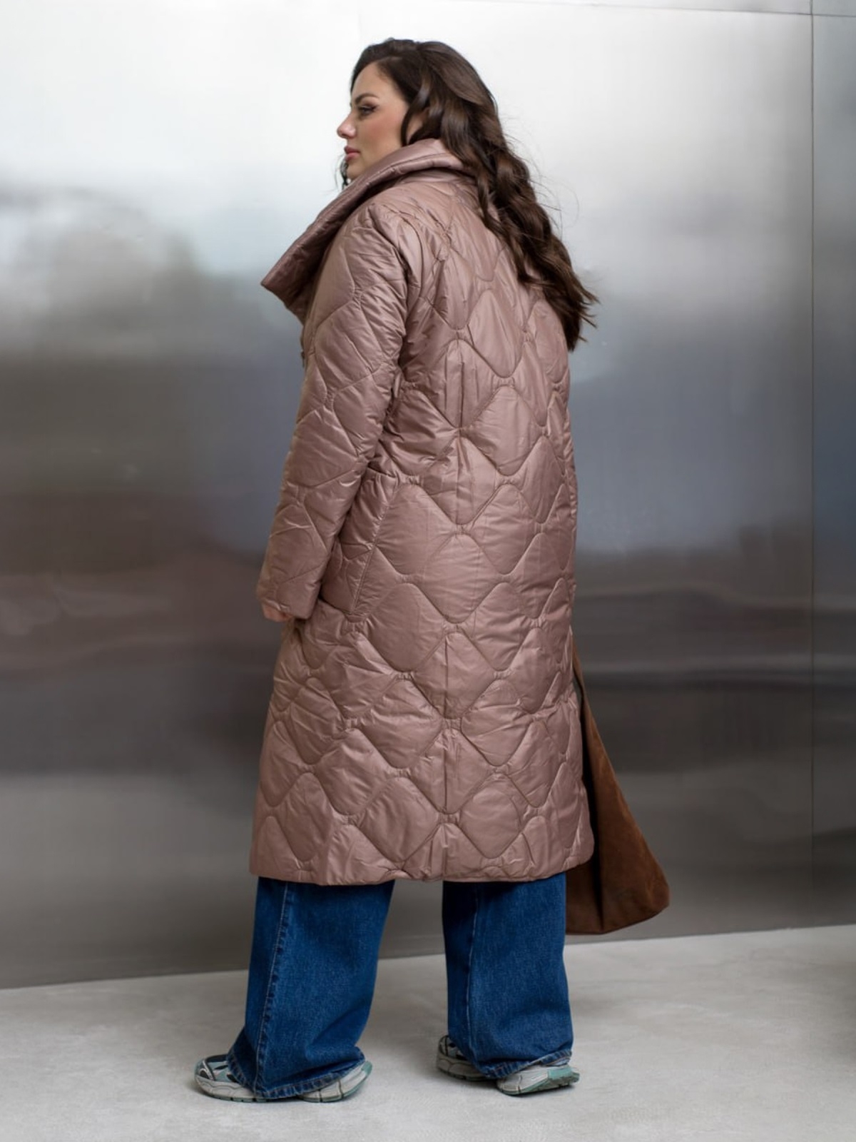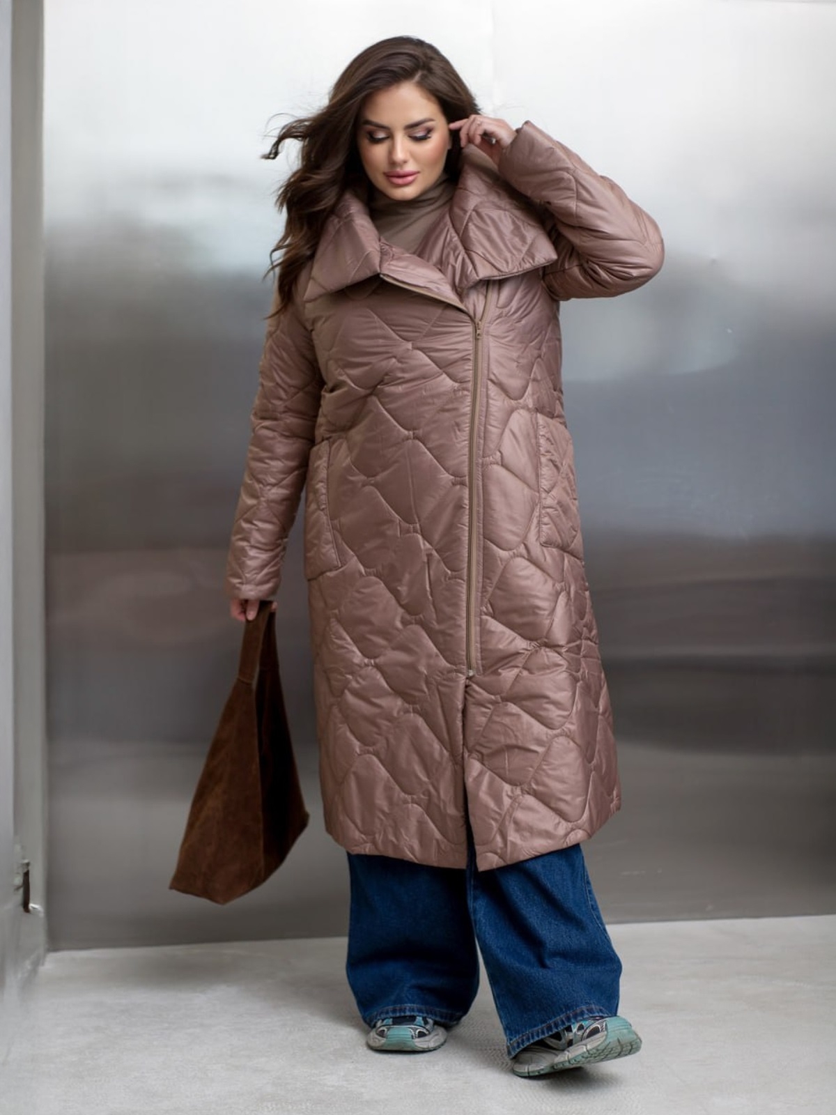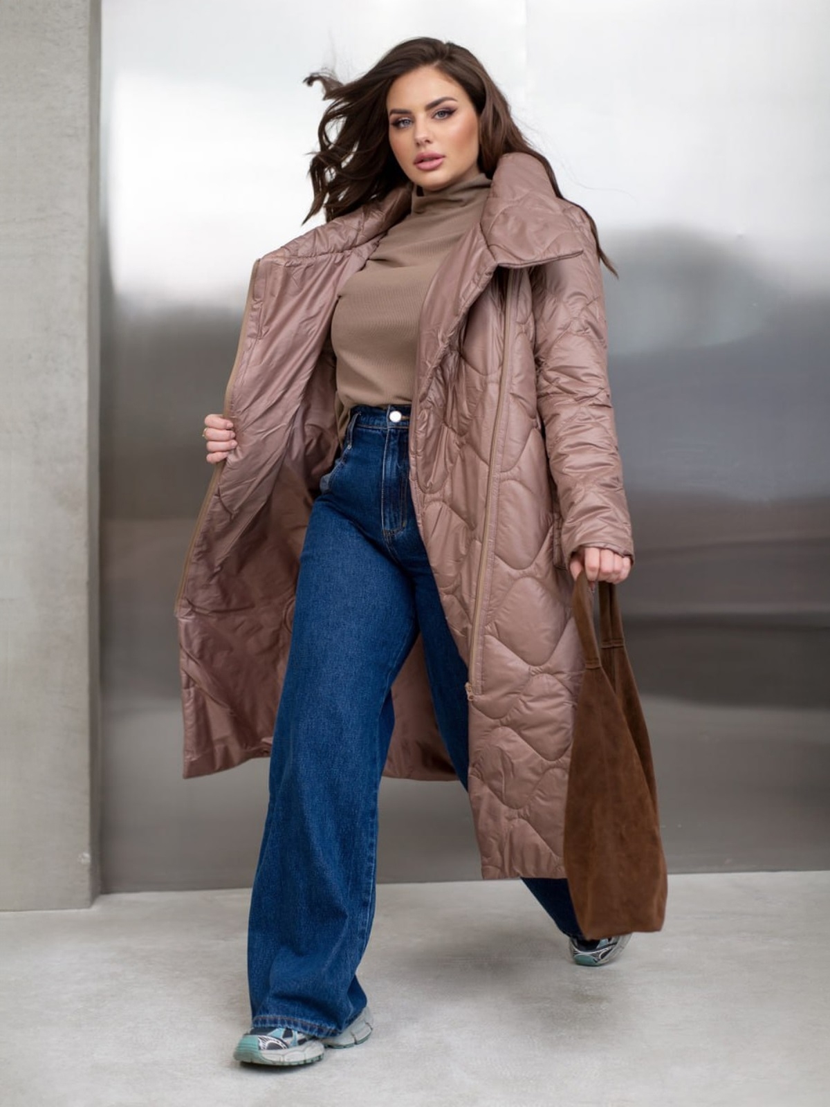 Повсякденна стьобана куртка довжини міді. Виріб із високим коміром. Для комфорту в носці доповнена великими накладними кишенями. Застібається на косу блискавку. Модель на підкладці. Утеплювач – синтепон, силікон 200 (50% силікон 50% синтепон). Розрахована на температурний режим до -15°С.