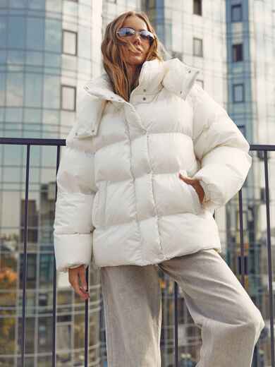 Стильна куртка з водовідштовхувальної тканини. Модель з коміром-стійкою і знімним капюшоном ідеально підходить для мінливої зимової погоди. Застібається на блискавку по всій довжині, яка прихована під планкою на кнопках для надійного захисту від вітру. Наповнювач — інноваційний синтетичний біопух, що складається з сплетених поліефірних волокон. Зберігає тепло і витримує температуру до -20°C. Низ регулюється зсередини за допомогою гумки з фіксатором, що дозволяє створити ідеальний силует і захиститися від піддування. Манжети рукавів на гумці забезпечують щільне прилягання до зап'ястя. Спереду розташовані дві прорізні кишені на блискавці, а всередині — одна накладна.