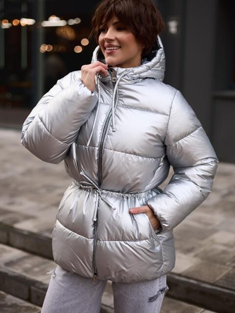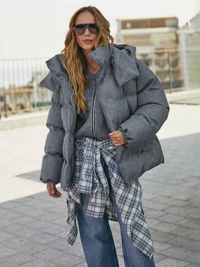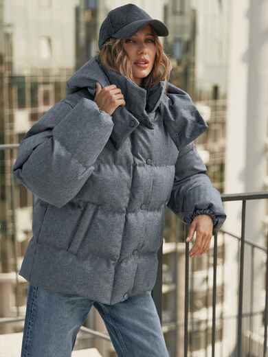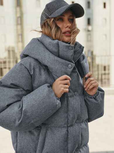 Пуфер зі щільної плащівки з імітацією візерунка пальтової тканини. Модель з коміром-стійкою і знімним капюшоном ідеально підходить для мінливої зимової погоди. Застібається на блискавку по всій довжині, яка прихована під планкою на кнопках для надійного захисту від вітру. Наповнювач — інноваційний синтетичний біопух, що складається з сплетених поліефірних волокон. Зберігає тепло і витримує температуру до -20°C. Низ регулюється зсередини за допомогою гумки з фіксатором, що дозволяє створити ідеальний силует і захиститися від піддування. Манжети рукавів на гумці забезпечують щільне прилягання до зап'ястя. Спереду розташовані дві прорізні кишені на блискавці, а всередині — одна накладна.
