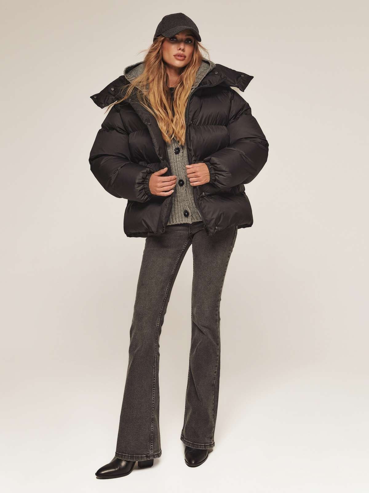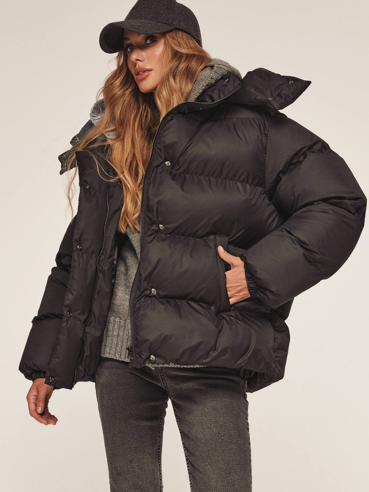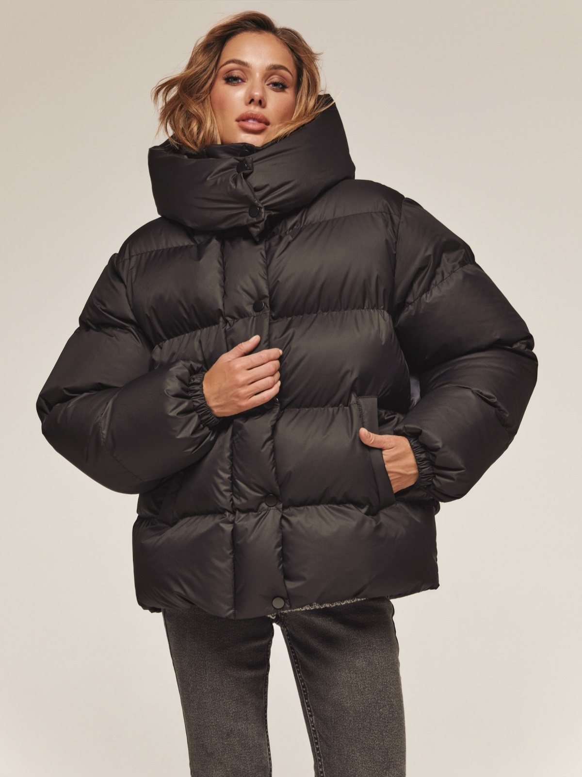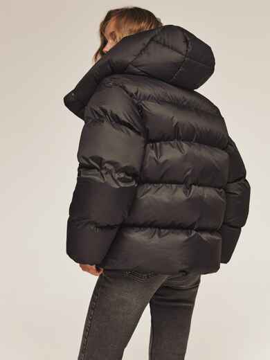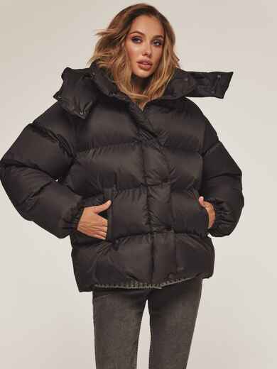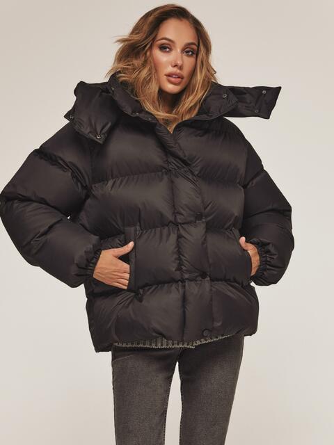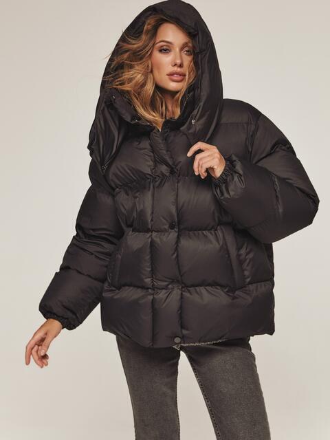 Стильна куртка з матової водовідштовхувальної тканини. Модель з коміром-стійкою і знімним капюшоном ідеально підходить для мінливої зимової погоди. Застібається на блискавку по всій довжині, яка прихована під планкою на кнопках для надійного захисту від вітру. Наповнювач — інноваційний синтетичний біопух, що складається з сплетених поліефірних волокон. Зберігає тепло і витримує температуру до -20°C. Низ регулюється зсередини за допомогою гумки з фіксатором, що дозволяє створити ідеальний силует і захиститися від піддування. Манжети рукавів на гумці забезпечують щільне прилягання до зап'ястя. Спереду розташовані дві прорізні кишені на блискавці, а всередині — одна накладна.