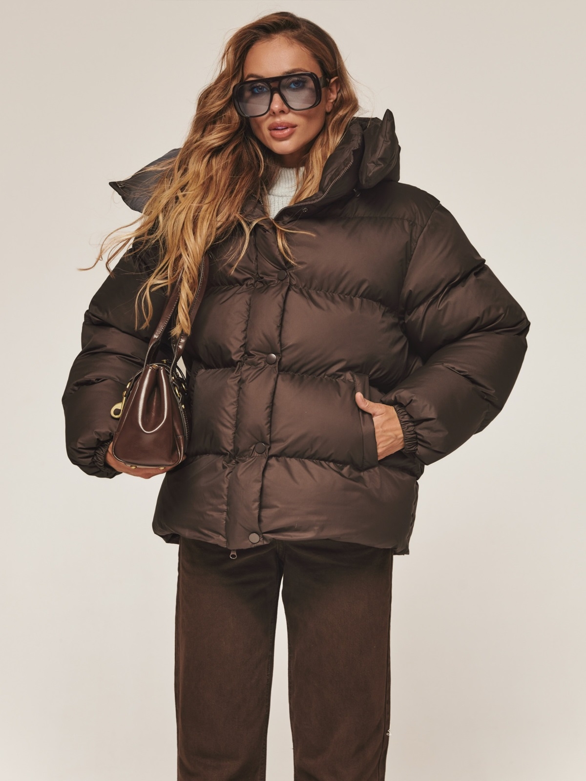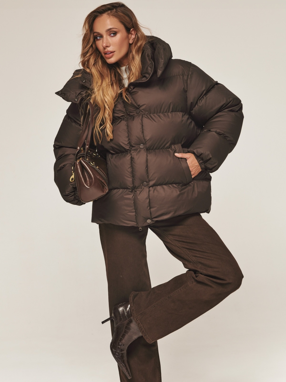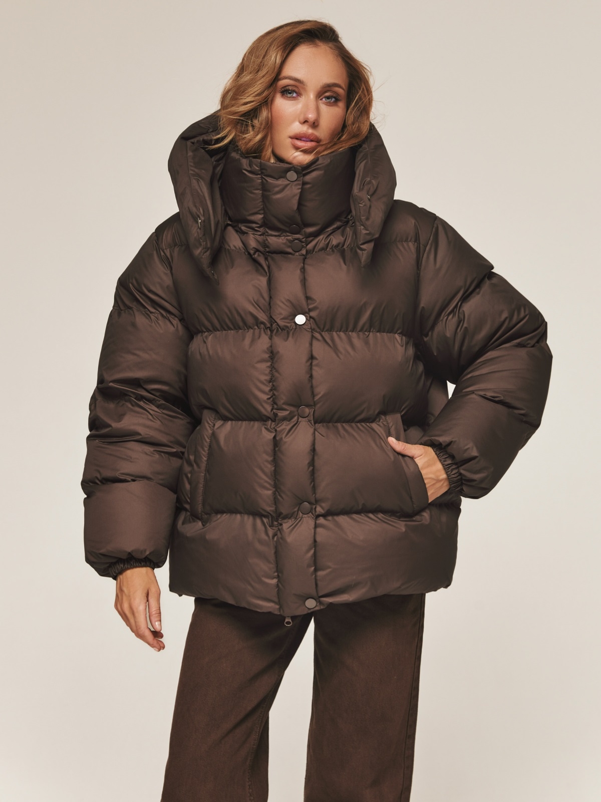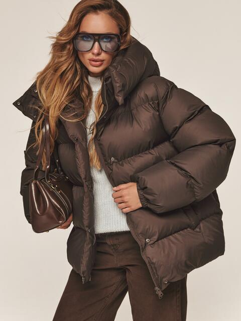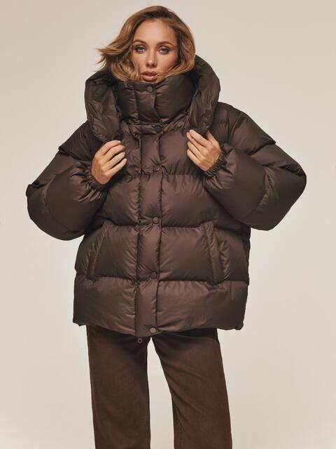 Стильна куртка з матової водовідштовхувальної тканини. Модель з коміром-стійкою і знімним капюшоном ідеально підходить для мінливої зимової погоди. Застібається на блискавку по всій довжині, яка прихована під планкою на кнопках для надійного захисту від вітру. Наповнювач — інноваційний синтетичний біопух, що складається з сплетених поліефірних волокон. Зберігає тепло і витримує температуру до -20°C. Низ регулюється зсередини за допомогою гумки з фіксатором, що дозволяє створити ідеальний силует і захиститися від піддування. Манжети рукавів на гумці забезпечують щільне прилягання до зап'ястя. Спереду розташовані дві прорізні кишені на блискавці, а всередині — одна накладна.