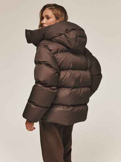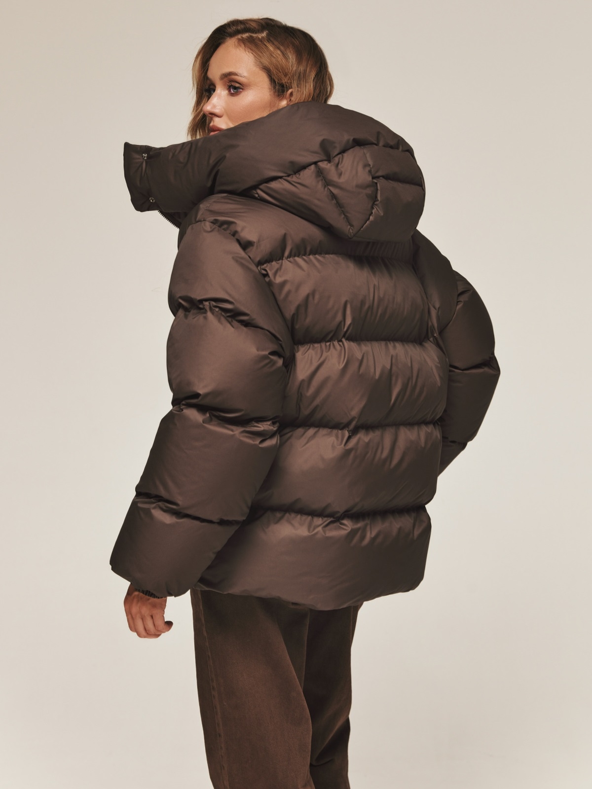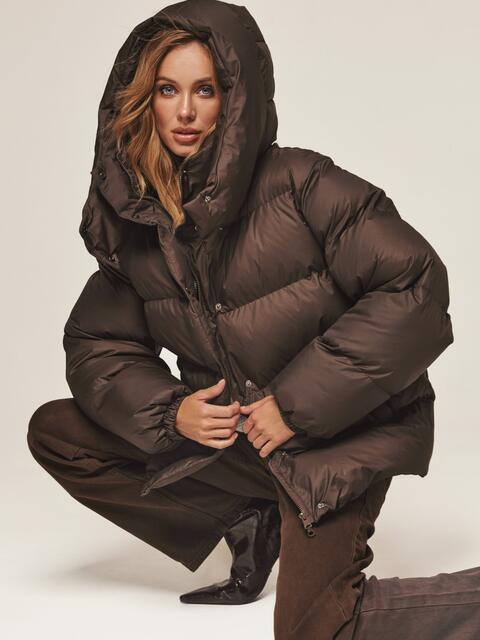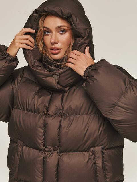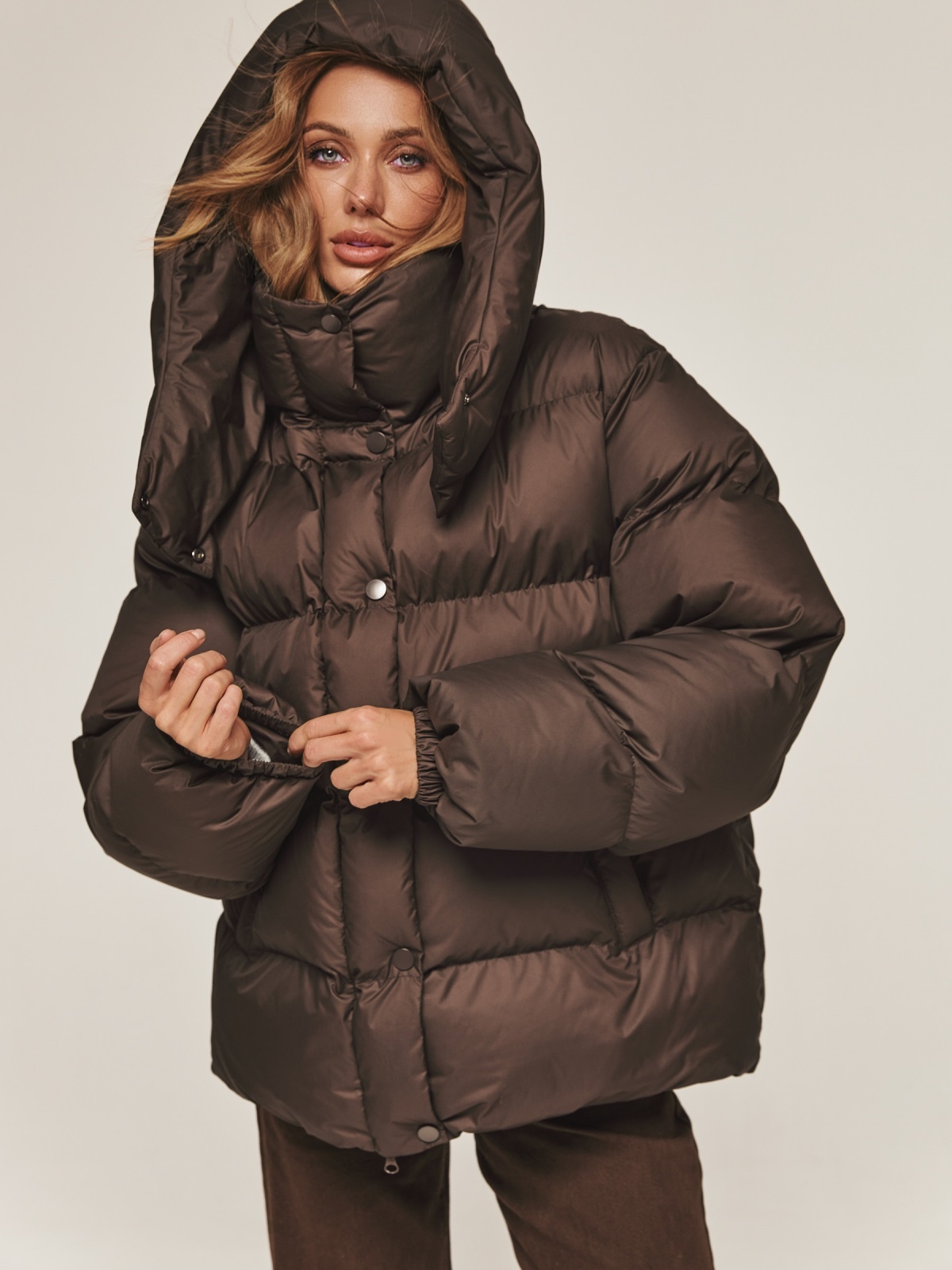 Стильна куртка з матової водовідштовхувальної тканини. Модель з коміром-стійкою і знімним капюшоном ідеально підходить для мінливої зимової погоди. Застібається на блискавку по всій довжині, яка прихована під планкою на кнопках для надійного захисту від вітру. Наповнювач — інноваційний синтетичний біопух, що складається з сплетених поліефірних волокон. Зберігає тепло і витримує температуру до -20°C. Низ регулюється зсередини за допомогою гумки з фіксатором, що дозволяє створити ідеальний силует і захиститися від піддування. Манжети рукавів на гумці забезпечують щільне прилягання до зап'ястя. Спереду розташовані дві прорізні кишені на блискавці, а всередині — одна накладна.