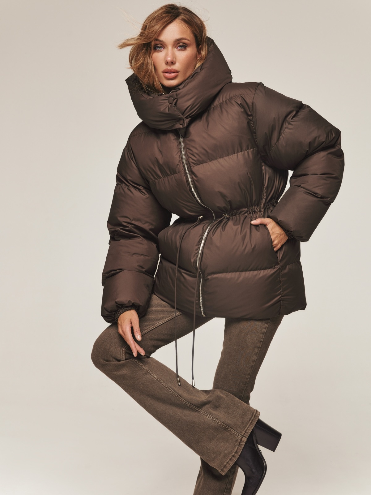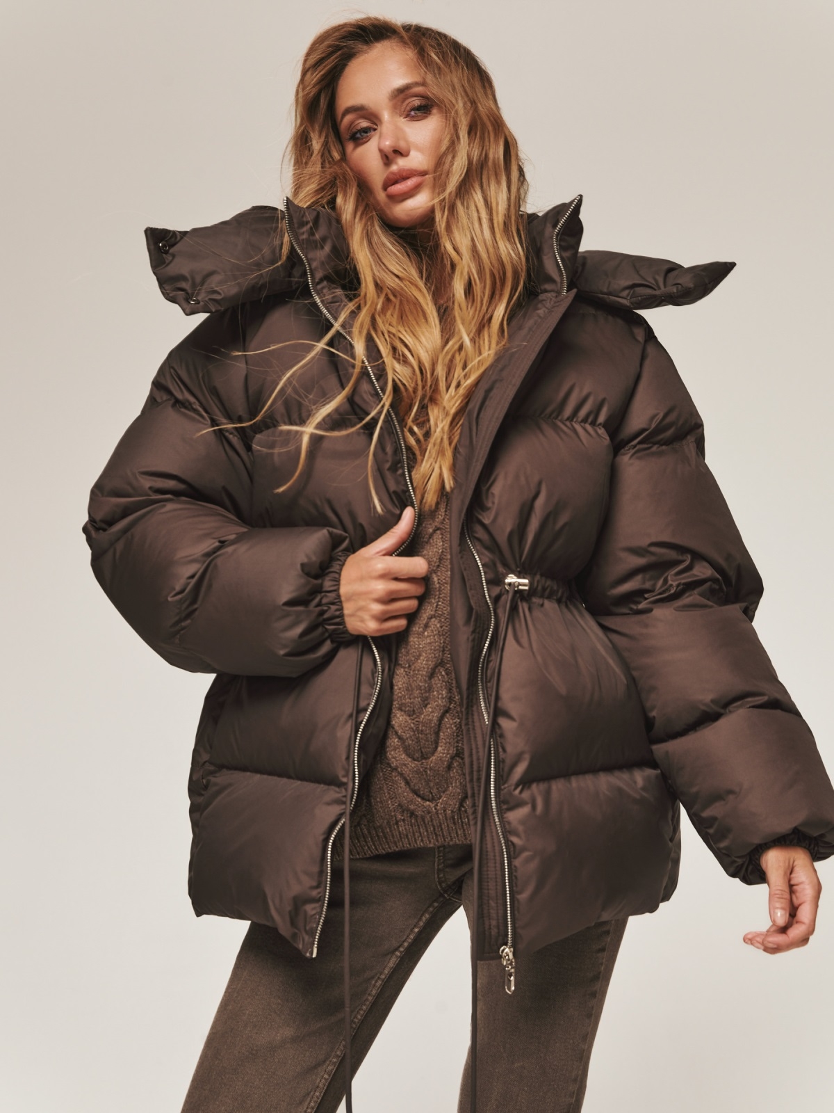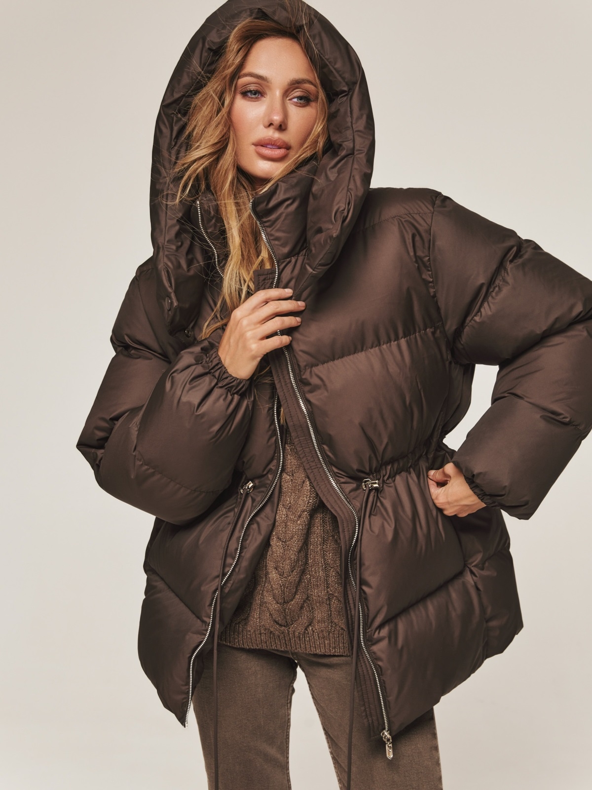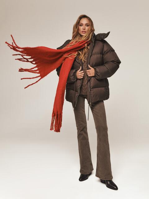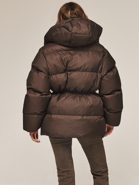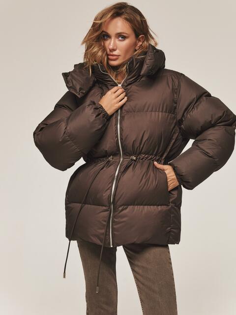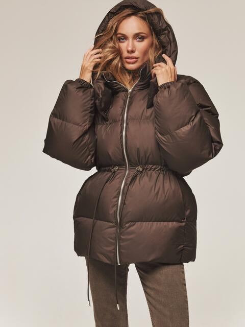 Пуфер з водовідштовхувальної тканини. Модель з коміром-стійкою і зручним знімним капюшоном ідеально підходить для мінливої зимової погоди. Застібається на блискавку по всій довжині. Наповнювач — інноваційний синтетичний біопух, що складається з сплетених поліефірних волокон. Він зберігає тепло і витримує температуру до -20°C. Талія регулюється за допомогою куліски, що дозволяє створити облягаючий силует або більш вільний образ. Манжети рукавів на гумці забезпечують щільне прилягання до зап'ястя. Спереду розташовані дві прорізні кишені на блискавці, а всередині — одна накладна.