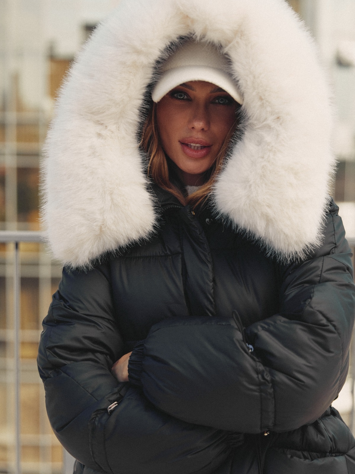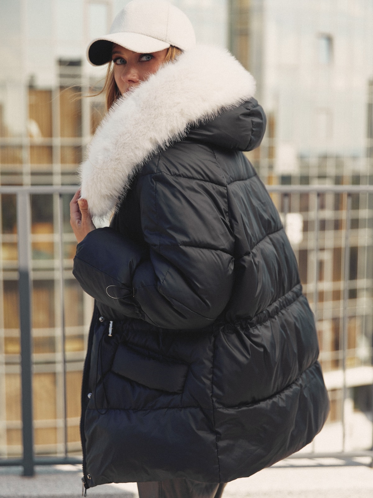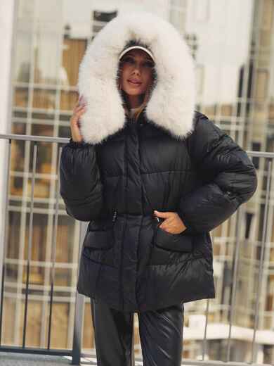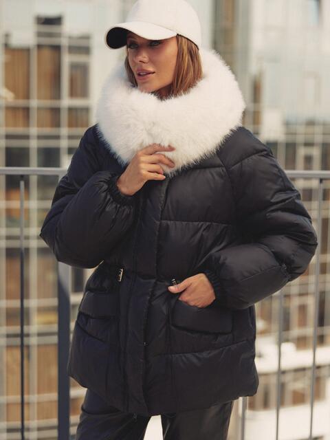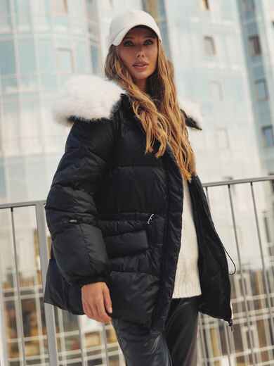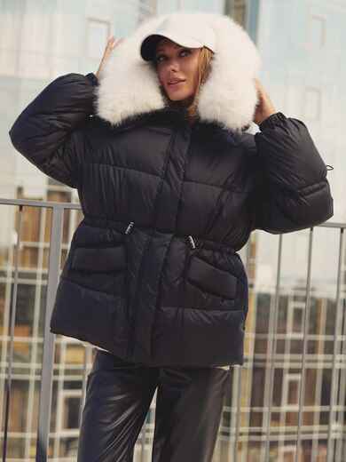 Стильна куртка з водовідштовхувальної плащової тканини «Глорія». Модель прикрашена штучним хутром в тон виробу на комірі. Капюшон не знімається, а штучне хутро на комірі легко відстібається за допомогою ґудзиків. Особливий акцент — куліска на талії та рукавах, що дозволяють надати куртці бажаний силует. Низ куртки також регулюється за допомогою гумки з фіксатором. Зручність доповнюють дві бічні кишені на кнопках і манжети на гумці на рукавах. Застібається на блискавку, приховану під планкою на кнопках, що забезпечує надійний захист від вітру. Наповнювач — біопух щільністю 3. Це інноваційний синтетичний матеріал, який прекрасно зберігає тепло і витримує температуру до -20°C.