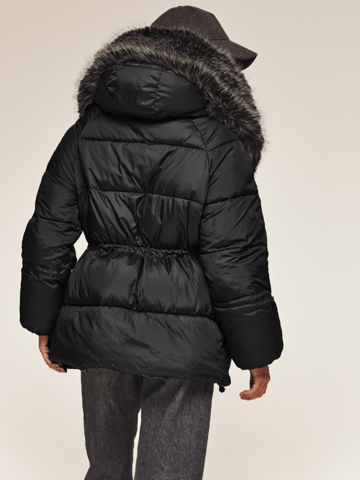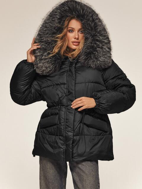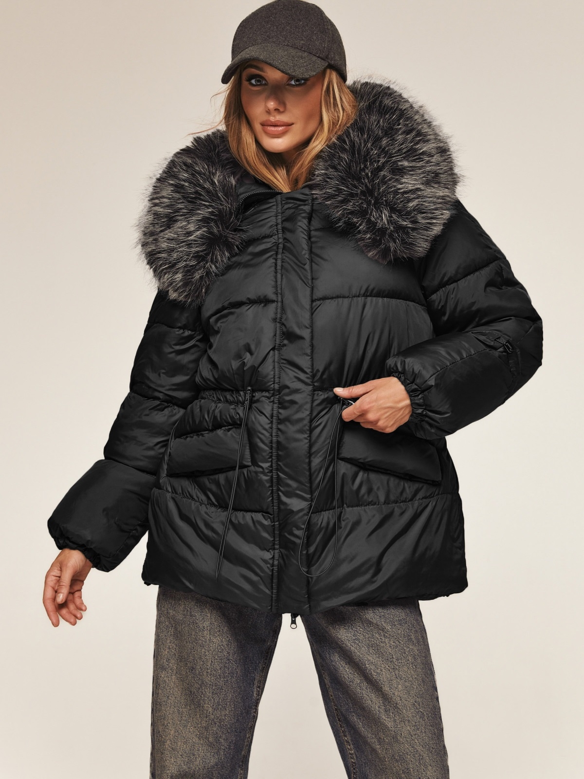 Стильна куртка з водовідштовхувальної плащової тканини «Глорія». Модель прикрашена штучним хутром в тон виробу на комірі. Капюшон не знімається, а штучне хутро на комірі легко відстібається за допомогою ґудзиків. Особливий акцент — куліска на талії та рукавах, що дозволяють надати куртці бажаний силует. Низ куртки також регулюється за допомогою гумки з фіксатором. Зручність доповнюють дві бічні кишені на кнопках і манжети на гумці на рукавах. Застібається на блискавку, приховану під планкою на кнопках, що забезпечує надійний захист від вітру. Наповнювач — біопух щільністю 3. Це інноваційний синтетичний матеріал, який прекрасно зберігає тепло і витримує температуру до -20°C.