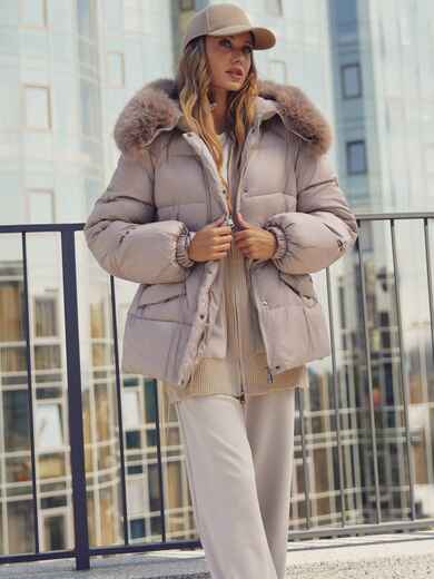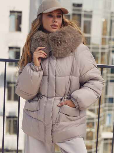 Стильна куртка з водовідштовхувальної плащової тканини «Глорія». Модель прикрашена штучним хутром в тон виробу на комірі. Капюшон не знімається, а штучне хутро на комірі легко відстібається за допомогою ґудзиків. Особливий акцент — куліска на талії та рукавах, що дозволяють надати куртці бажаний силует. Низ куртки також регулюється за допомогою гумки з фіксатором. Зручність доповнюють дві бічні кишені на кнопках і манжети на гумці на рукавах. Застібається на блискавку, приховану під планкою на кнопках, що забезпечує надійний захист від вітру. Наповнювач — біопух щільністю 3. Це інноваційний синтетичний матеріал, який прекрасно зберігає тепло і витримує температуру до -20°C.