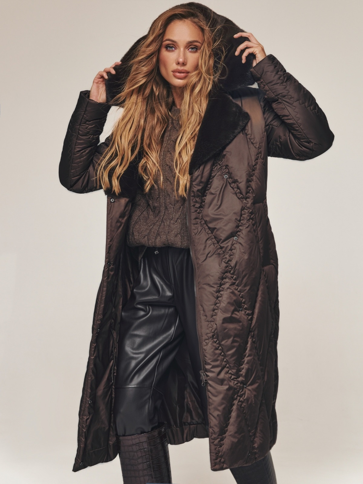 Довга стьобана зимова куртка. Модель з широкими лацканами, декорованими штучним хутром, що створює відчуття розкоші та затишку. Хутро на комірі не відстібається. Вшитий капюшон забезпечує додатковий захист від вітру та снігу. Прорізні кишені додають функціональності. Застібається на блискавку і кнопки. Верхня частина застібається на ґудзик з петелькою. Утеплювач – біо-пух. Розрахована на температуру до -15°C. Для збереження зовнішнього вигляду і властивостей виробу рекомендуємо хімчистку. Це забезпечить професійний догляд і довговічність.